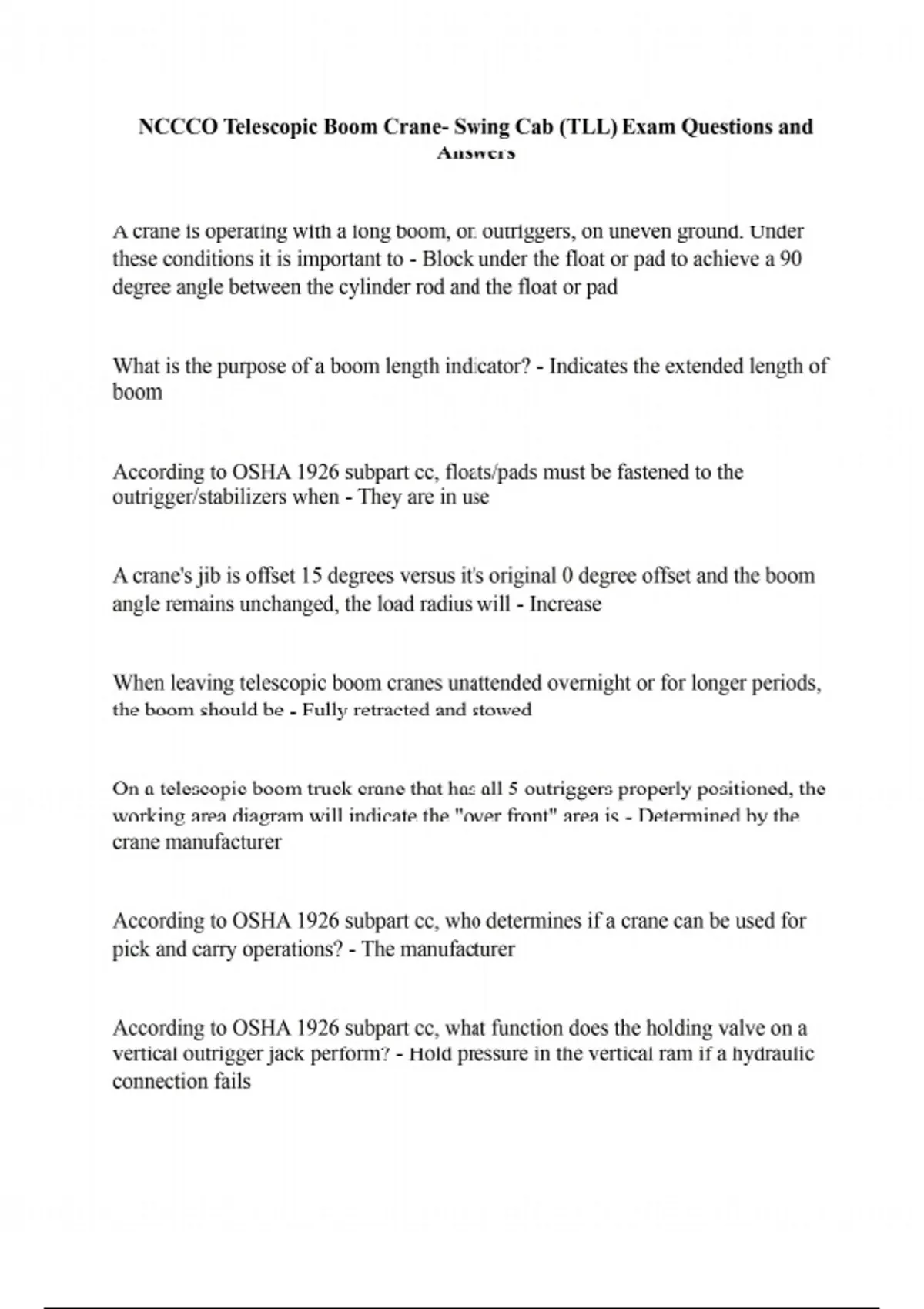 When a crane's telescopic boom sections are required to be extended equally, and the are not, the - Longest section can be overloaded With the boom extension mounted on the boom tip, the main boom rating must be reduced to compensate for the boom extension's - Effective weight According to OSHA 1926.1433, which of the following must be on the crane? A. A fire extinguisher B. Anti two-block warning system C. Battery disconnect switch D. Vehicle identification number - A. A fire extinguisher A carrier-mounted crane that is set up on outriggers should have the tires on the carrier - Off the supporting surface When a rough terrain crane is working on tires, backward tipping is most likely to occur when the unloaded boom is position over the - Side at short radius When performing pick and carry operations with a rough terrain crane, you should keep the load - Positioned over the front of the carrier In which outrigger configuration would a crane be the most susceptible to tipping from a rapidly swinging load? - Outriggers up and in According to OSHA 1926 subpart cc, when extending outriggers from the crane's upper structure, the operator shall - Make visual contact or post a signal person