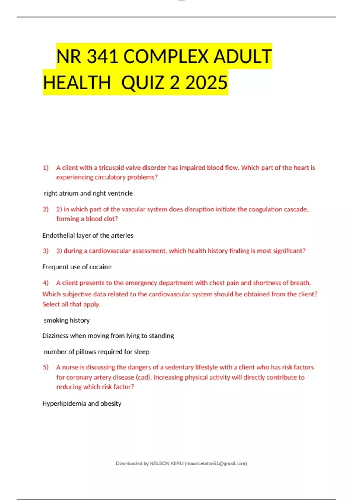 NR 341 COMPLEX ADULT HEALTH QUIZ 2 2025 1) A client with a tricuspid valve disorder has impaired blood flow. Which part of the heart is experiencing circulatory problems? right atrium and right ventricle 2) 2) in which part of the vascular system does disruption initiate the coagulation cascade, forming a blood clot? Endothelial layer of the arteries 3) 3) during a cardiovascular assessment, which health history finding is most significant? Frequent use of cocaine 4) A client presents to the emergency department with chest pain and shortness of breath. Which subjective data related to the cardiovascular system should be obtained from the client? Select all that apply. smoking history Dizziness when moving from lying to standing number of pillows required for sleep