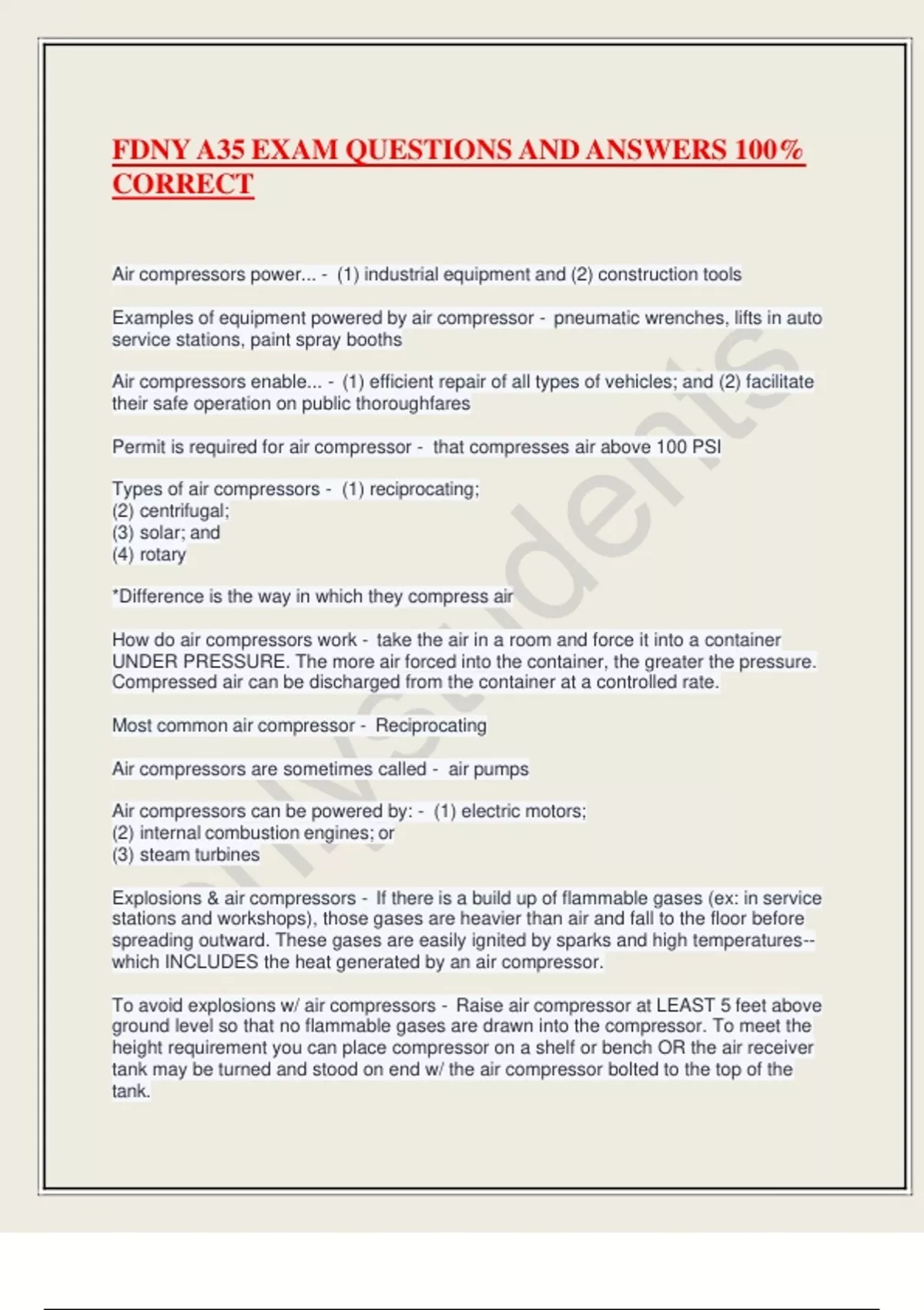 FDNY A35 EXAM QUESTIONS AND ANSWERS 100% CORRECTAir compressors power... - (1) industrial equipment and (2) construction tools Examples of equipment powered by air compressor - pneumatic wrenches, lifts in auto service stations, paint spray booths Air compressors enable... - (1) efficient repair of all types of vehicles; and (2) facilitate their safe operation on public thoroughfares Permit is required for air compressor - that compresses air above 100 PSI Types of air compressors - (1) reciprocating; (2) centrifugal; (3) solar; and (4) rotary *Difference is the way in which they compress air How do air compressors work - take the air in a room and force it into a container UNDER PRESSURE. The more air forced into the container, the greater the pressure. Compressed air can be discharged from the container at a controlled rate. Most common air compressor - Reciprocating Air compressors are sometimes called - air pumps Air compressors can be powered by: - (1) electric motors; (2) internal combustion engines; or (3) steam turbines Explosions & air compressors - If there is a build up of flammable gases (ex: in service stations and workshops), those gases are heavier than air and fall to the floor before spreading outward. These gases are easily ignited by sparks and high temperatures-- which INCLUDES the heat generated by an air compressor. To avoid explosions w/ air compressors - Raise air compressor at LEAST 5 feet above ground level so that no flammable gases are drawn into the compressor. To meet the height requirement you can place compressor on a shelf or bench OR the air receiver tank may be turned and stood on end w/ the air compressor bolted to the top of the tank. Power to air compressor - entire unit is driven by an electric motor. Motor activates a series of drive belts. Belts power the moving parts of the unit--like w/ power steering and alternator in automobile Compression Chamber operation - Air is compressed in compression chamber which consists of a PISTON inside a CYLINDER. Piston moves up and down. When piston moves down -->draws air into cylinder, through INTAKE VALVE (valve automatically opens when piston moves down). When piston moves up-->air is compressed (intake vale automatically closes to avoid air escaping from cylinder). Air Reciever Operation - When air pressure reaches a certain level, it forces open a DISCHARGE VALVE (which is spring loaded). This releases compressed air into air reciever (aka air tank), which is what supplies compressed air when needed. Single Stage Air Compressor - with one cylinder and one piston Multi Stage Air Compressor - with more than one piston and cylinder. Each cylinder will increase the pressure of the air by taking air from the discharge side of the previous cylinder and increasing the pressure to a new level. Once it reaches the last level, the pressurized air is discharged into the reciever. As air is compressed it becomes - heated. This is why in a multi stage air compressor there is an intercooler between stages of compressor. Exception to single stage/multi stage distinction - CAVEAT: there are air compressors with multiple pistons and cylinders that are single stage but these are only the ones where each cylinder discharges directly into air receiver (unlike a true multi stage air compressor). Storage containers - some systems force the compressed air from the receiver into storage containers allowing it to be used later as needed. System of Connected Air Compressors - Air forced from one compressor into another several time to increase pressure each time and ultimately forced into a hose line or storage container. Used when there is a need for air under very high pressure. Unloading Valve - safety component. Pressure bGauge b- b bsafety bcomponent. bswitch bin bthe bdesired bdirection bto badjustbpressure. blevel bthere bcould bbe bexplosion. bPressure bin bthe breceiver bis bcontrolled bbybabswitch; bturn bMustbNEVER bexceed bmanufacturer's brecommendations. bIf bgreater bthan brecommended Indicates bpressurebinsidebreceiver. bCFbholderbshouldbpaybclosebattentionbtobreading. PressurebRelief bValve b- b bsafety bcomponent. brelief bvalve bautomatically. bMayboperate bmanually bbybpullingbonbthebringbattachedbtobthebpressure Allows bair bto bescape bfrom bthebsystem bwhen bpressure bis btoobgreat. bOperate Air bintakebvalve b- b bsafety bcomponent. bFire bcould bcase bdamage bto bair bcompressor. b bDustbin bthe bcompressor bcould bresult bin bfire bin bthe bcylinder bb/c bof bheat bin bthe bcylinder. Fittedbw/ banbair bfilter bwhichbprevents bdustbfrombbeingbdrawnbintobcompressionbcylinder. bthe bcompressor. This bis bwhybits bimportant btobmakebsurebfilter bis balways bcleanbandbsecurely bconnectedbto Filter b&bMoisturebSeparator bAssembly b(FMSA) b- b bsafety bcomponent. Moisture bcan bbe babproblem; bthis bfilter bremoves bmoisture bfrom bcompressed bair. b Installed bbetween bcompressor band breceiver. b Drain bcock battached btobFMSAbtobdrain bwater bandbdirt. bmore bpressure bneeded. Shuts bdown bcompressor bwhen bpressure bin breceiver bis badequate band brestarts bwhen Automatic bControl bDevice b- b bAttached bto breceiver. b Safety bRelief bValves b- b bsafety bcomponent.