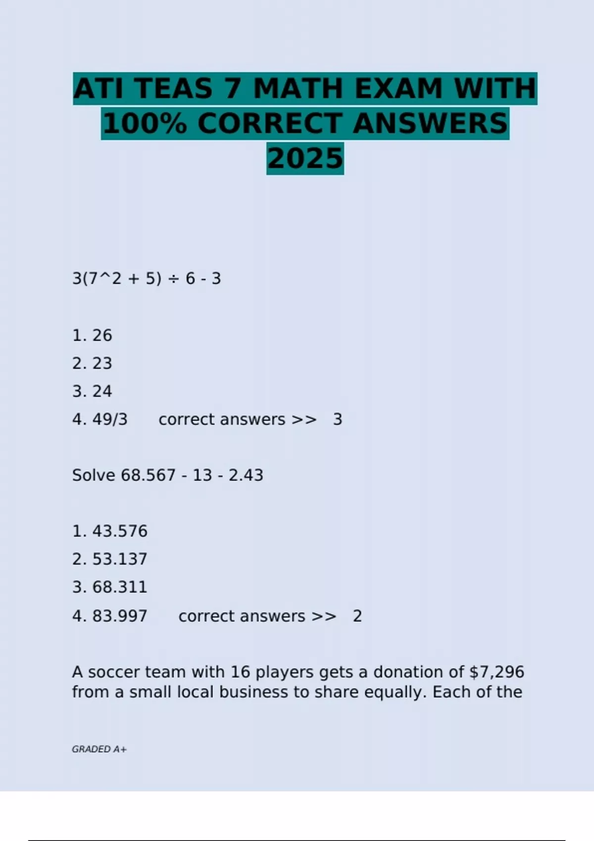 ATI TEAS 7 MATH EXAM WITH