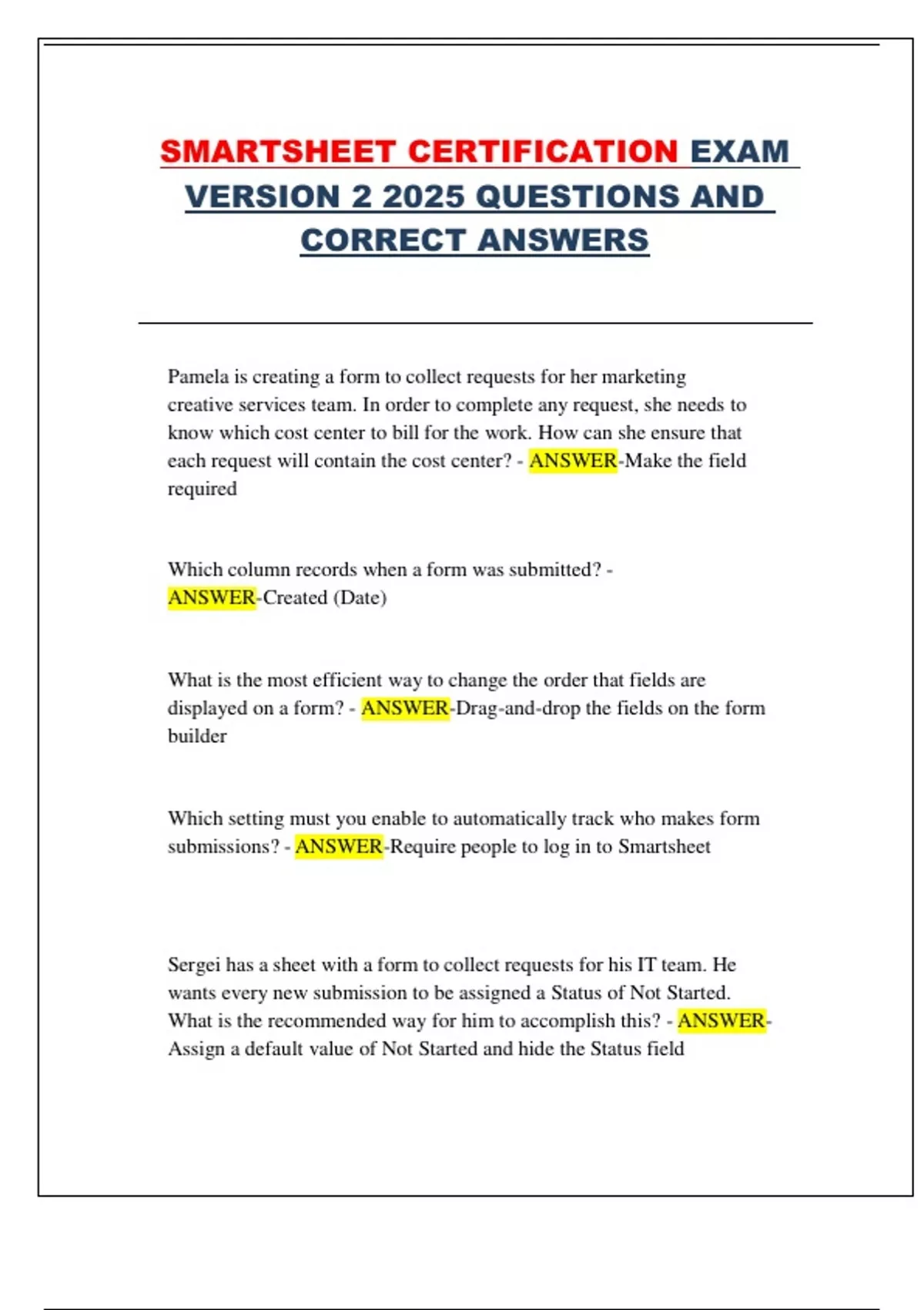 This document provides a complete set of verified questions and correct answers for the Smartsheet Certification Exam Version 2, updated for 2025. It covers key topics such as form creation, automation workflows, formula usage, reports, dashboards, permissions, and sheet collaboration. Suitable for anyone preparing for the official certification exam, this guide ensures thorough coverage of practical use cases and system functionality.