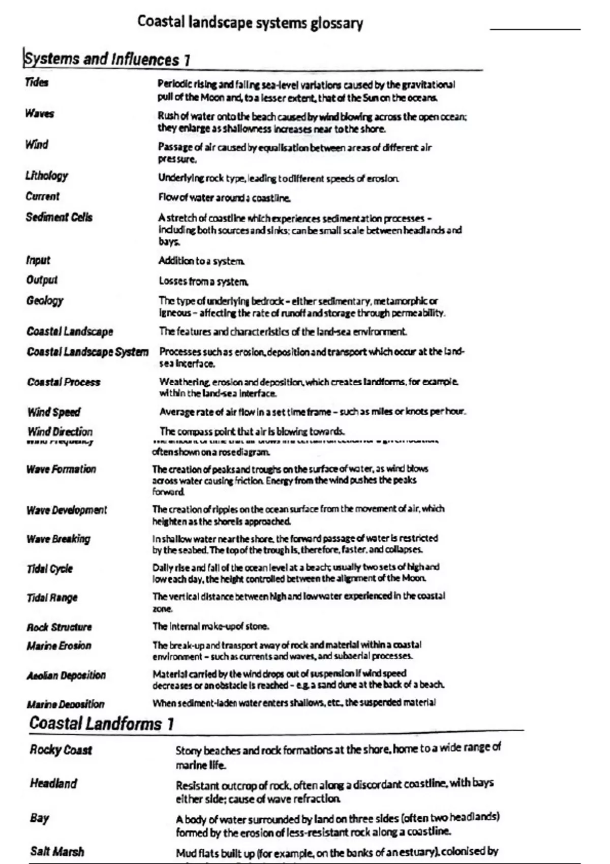 This document provides the key terms for the Coastal Landscapes topic within Physical Geography.
