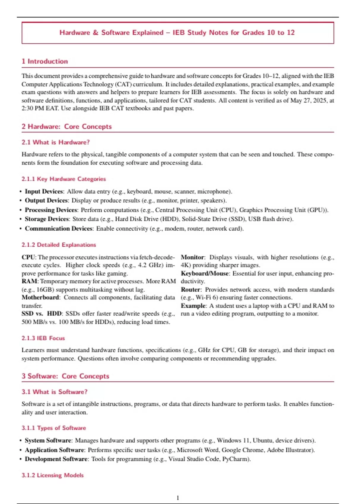 Hardware & Software Explained– IEB Study Notes for Grades 10 to 12 1 Introduction This documentprovidesacomprehensiveguidetohardwareandsoftwareconceptsforGrades10–12, alignedwiththeIEB ComputerApplicationsTechnology(CAT)curriculum. Itincludesdetailedexplanations, practical examples, andexample exam questions with answers and helpers to prepare learners for IEB assessments. The focus is solely on hardware and software definitions, functions, and applications, tailored for CAT students. All content is verified as of May 27, 2025, at 2:30 PM EAT. Use alongside IEB CAT textbooks and past papers.