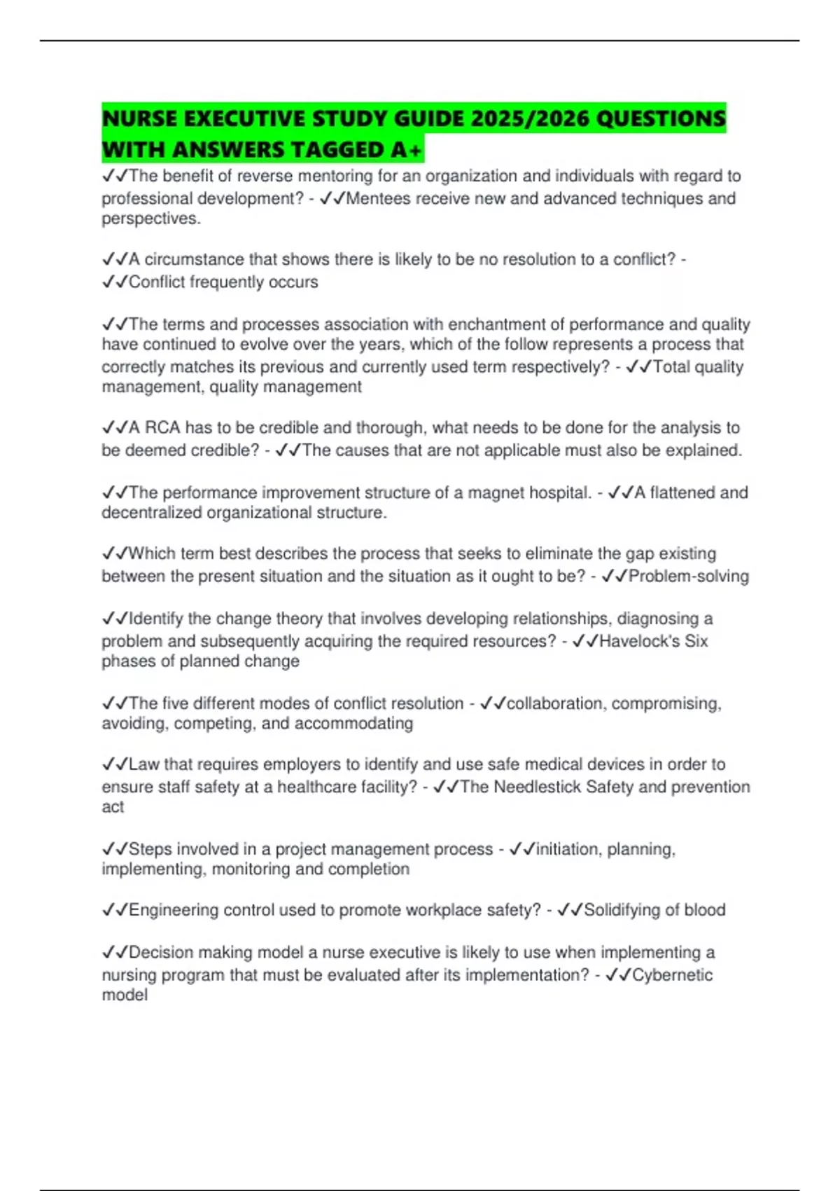 NURSE EXECUTIVE STUDY GUIDE 2025/2026 QUESTIONS WITH ANSWERS TAGGED A+