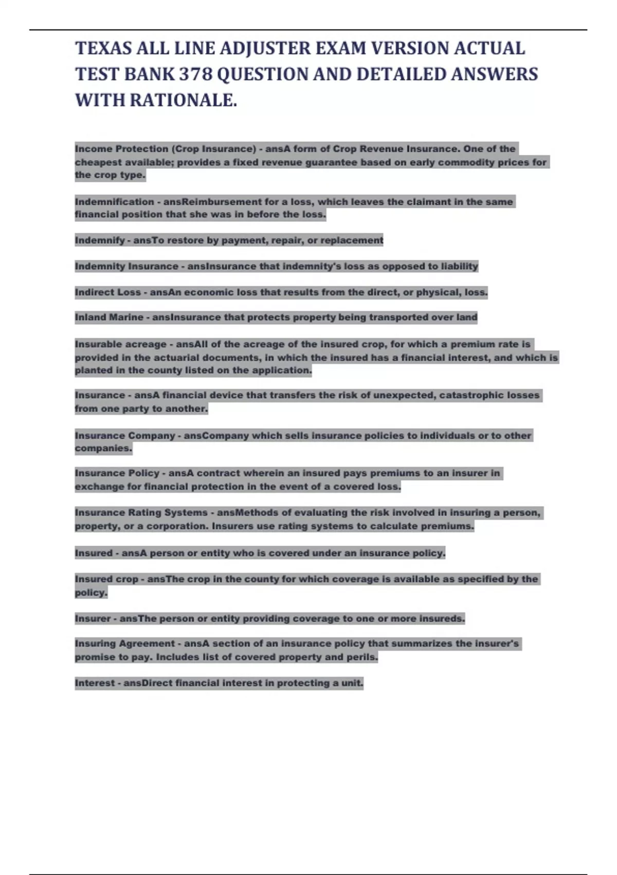 TEXAS ALL LINE ADJUSTER EXAM VERSION ACTUAL TEST BANK 378 QUESTION AND DETAILED
