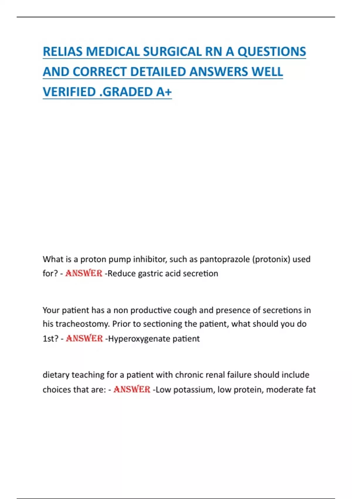 RELIAS MEDICAL SURGICAL RN A QUESTIONS AND CORRECT DETAILED ANSWERS WELL VERIFIED .GRADED A+