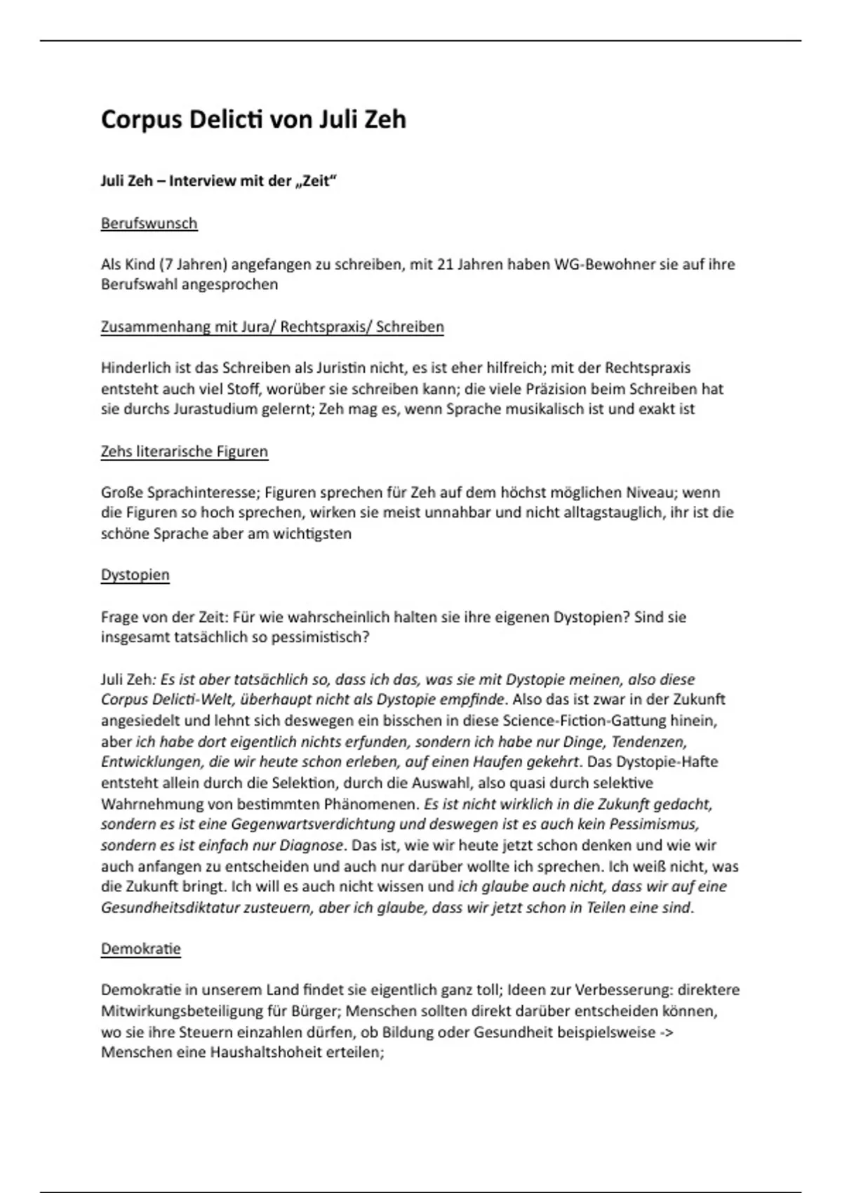 Die Zusammenfassung von Corpus Delicti enthält... Figurenkonstellationen, Juli Zeh Interviewauswertung, Analyse des Romananfangs, der Exposition; Kennzeichen der Methode; Merkmale einer Diktatur; Mias Weg zur Widerstandskämpferin; kurze Kapitelzusammenfassungen; Corpus Delicti als politischer Roman und die Gattungsfrage: Science-Fiction oder eine Dystopie?