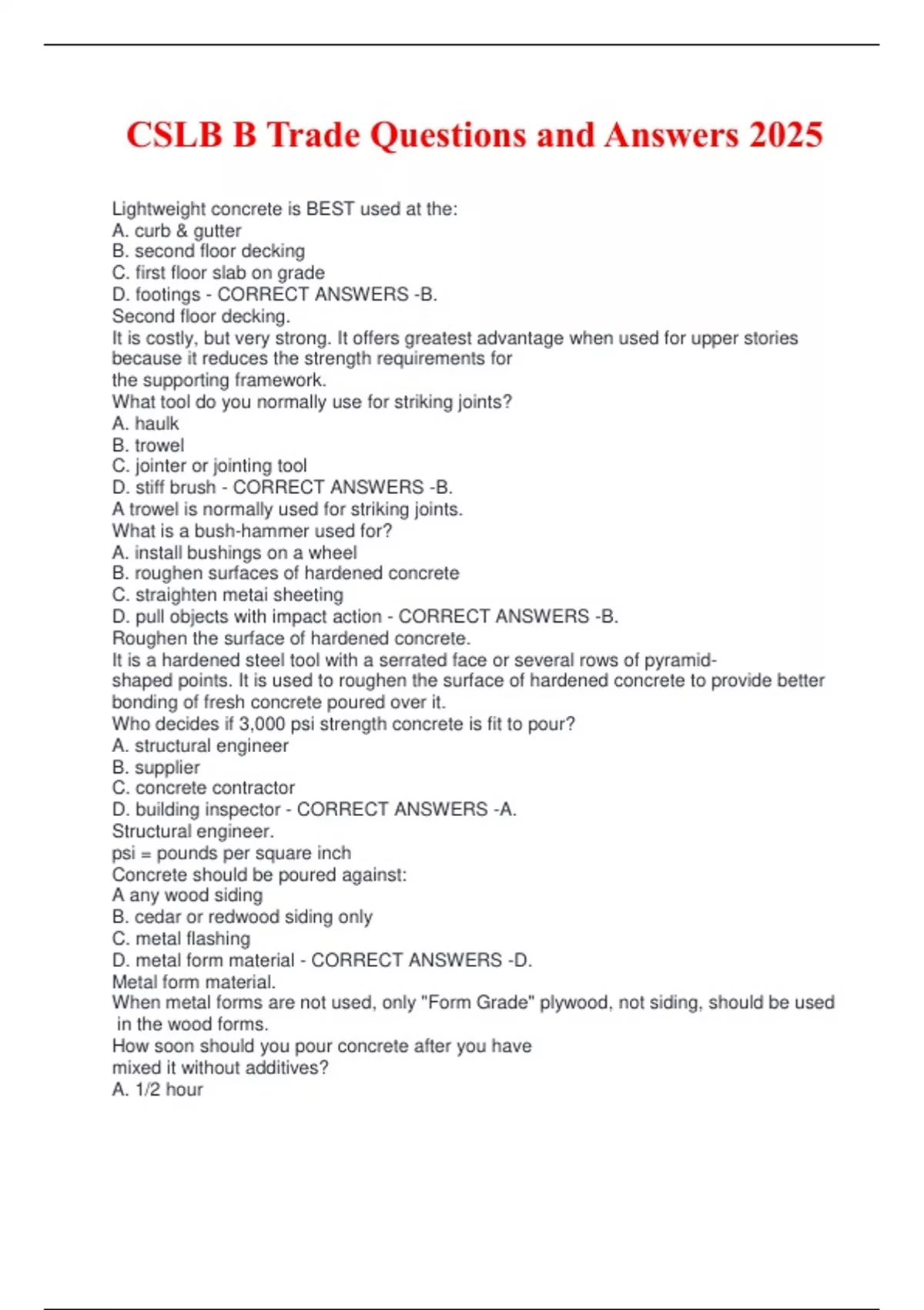 CSLB B Trade Questions and Answers 2025