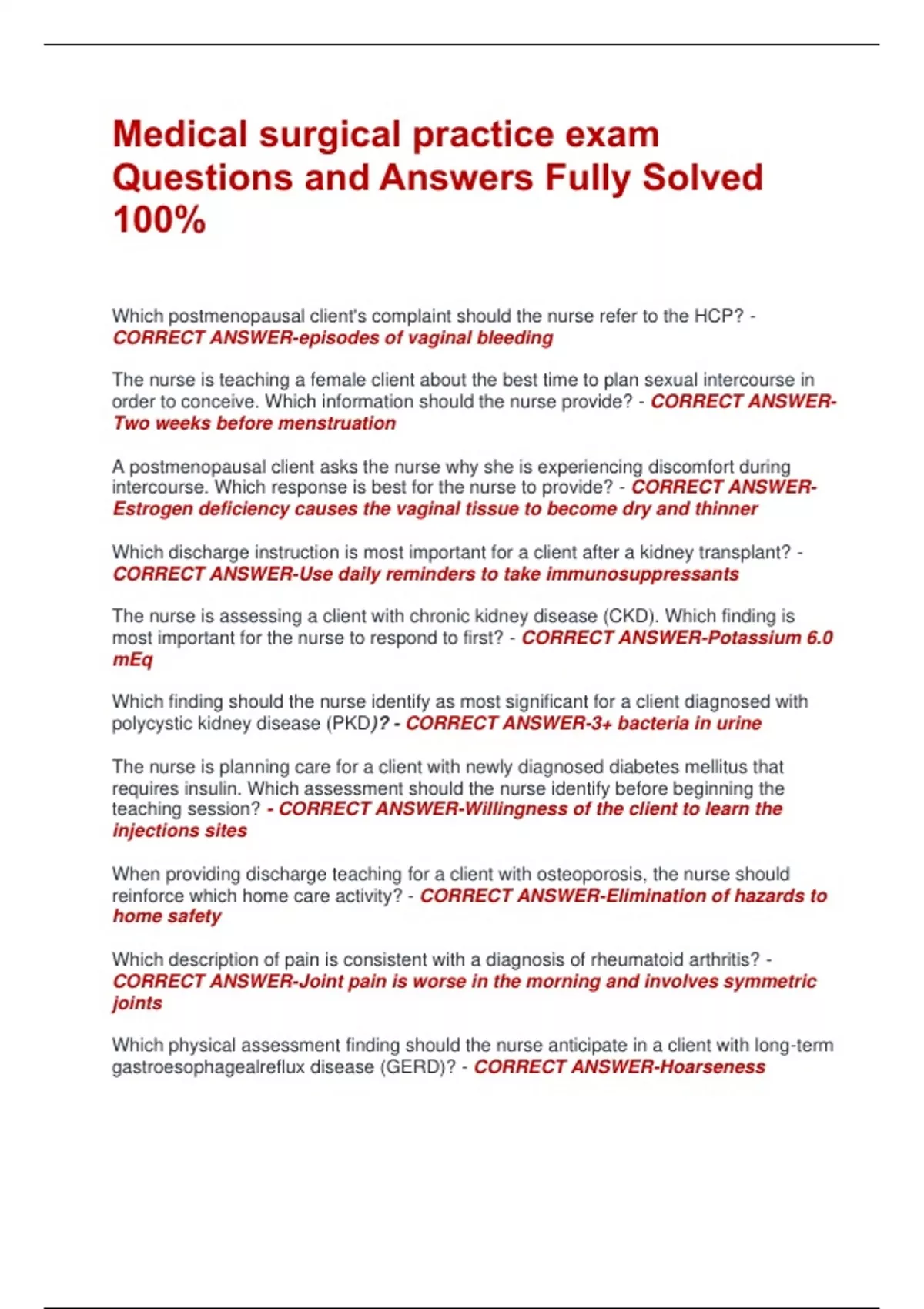 Which postmenopausal client's complaint should the nurse refer to the HCP? - CORRECT ANSWER-episodes of vaginal bleeding The nurse is teaching a female client about the best time to plan sexual intercourse in order to conceive. Which information should the nurse provide? - CORRECT ANSWERTwo weeks before menstruation A postmenopausal client asks the nurse why she is experiencing discomfort during intercourse. Which response is best for the nurse to provide? - CORRECT ANSWEREstrogen deficiency causes the vaginal tissue to become dry and thinner Which discharge instruction is most important for a client after a kidney transplant? - CORRECT ANSWER-Use daily reminders to take immunosuppressants The nurse is assessing a client with chronic kidney disease (CKD). Which finding is most important for the nurse to respond to first? - CORRECT ANSWER-Potassium 6.0 mEq Which finding should the nurse identify as most significant for a client diagnosed with polycystic kidney disease (PKD)? - CORRECT ANSWER-3+ bacteria in urine The nurse is planning care for a client with newly diagnosed diabetes mellitus that requires insulin. Which assessment should the nurse identify before beginning the teaching session? - CORRECT ANSWER-Willingness of the client to learn the injections sites When providing discharge teaching for a client with osteoporosis, the nurse should reinforce which home care activity? - CORRECT ANSWER-Elimination of hazards to home safety Which description of pain is consistent with a diagnosis of rheumatoid arthritis? - CORRECT ANSWER-Joint pain is worse in the morning and involves symmetric joints Which physical assessment finding should the nurse anticipate in a client with long-term gastroesophagealreflux disease (GERD)? - CORRECT ANSWER-Hoarseness