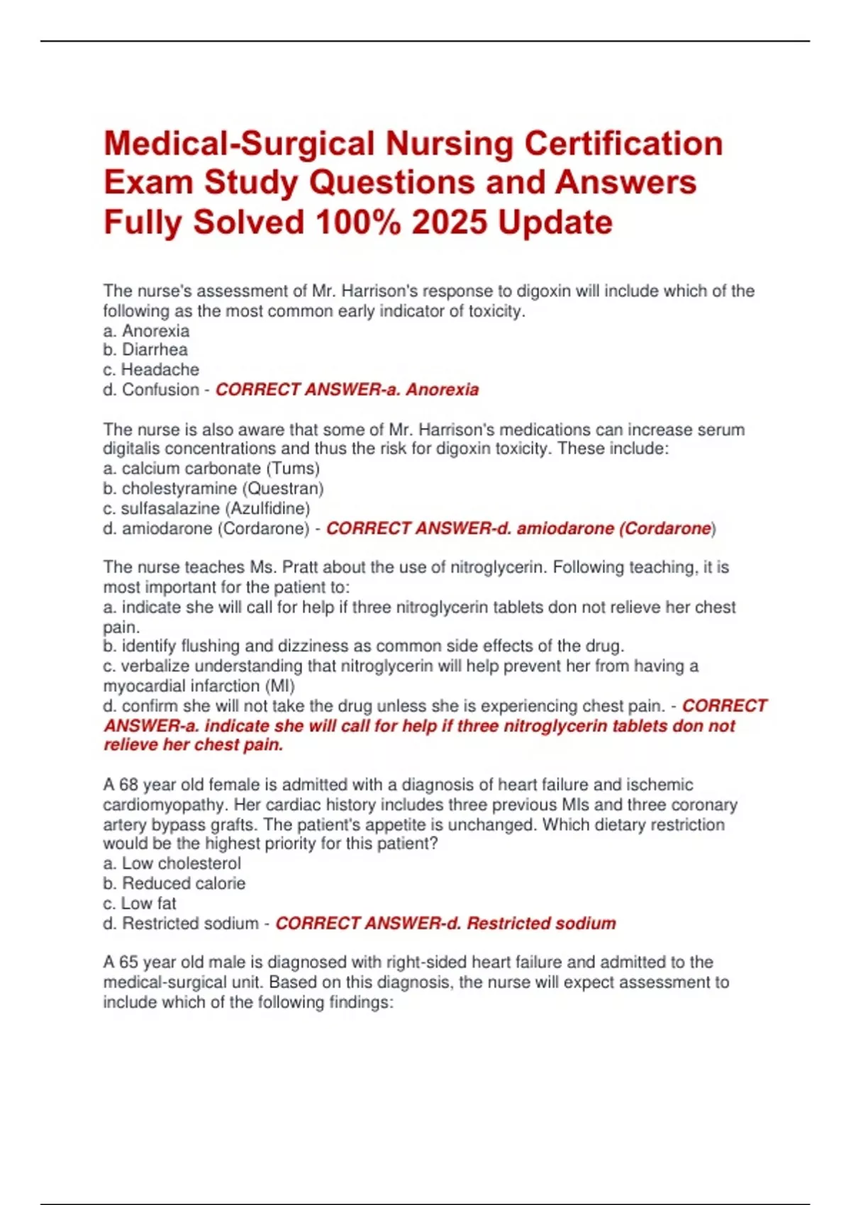 The nurse's assessment of Mr. Harrison's response to digoxin will include which of the following as the most common early indicator of toxicity. a. Anorexia b. Diarrhea c. Headache d. Confusion - CORRECT ANSWER-a. Anorexia The nurse is also aware that some of Mr. Harrison's medications can increase serum digitalis concentrations and thus the risk for digoxin toxicity. These include: a. calcium carbonate (Tums) b. cholestyramine (Questran) c. sulfasalazine (Azulfidine) d. amiodarone (Cordarone) - CORRECT ANSWER-d. amiodarone (Cordarone) The nurse teaches Ms. Pratt about the use of nitroglycerin. Following teaching, it is most important for the patient to: a. indicate she will call for help if three nitroglycerin tablets don not relieve her chest pain. b. identify flushing and dizziness as common side effects of the drug. c. verbalize understanding that nitroglycerin will help prevent her from having a myocardial infarction (MI) d. confirm she will not take the drug unless she is experiencing chest pain. - CORRECT ANSWER-a. indicate she will call for help if three nitroglycerin tablets don not relieve her chest pain