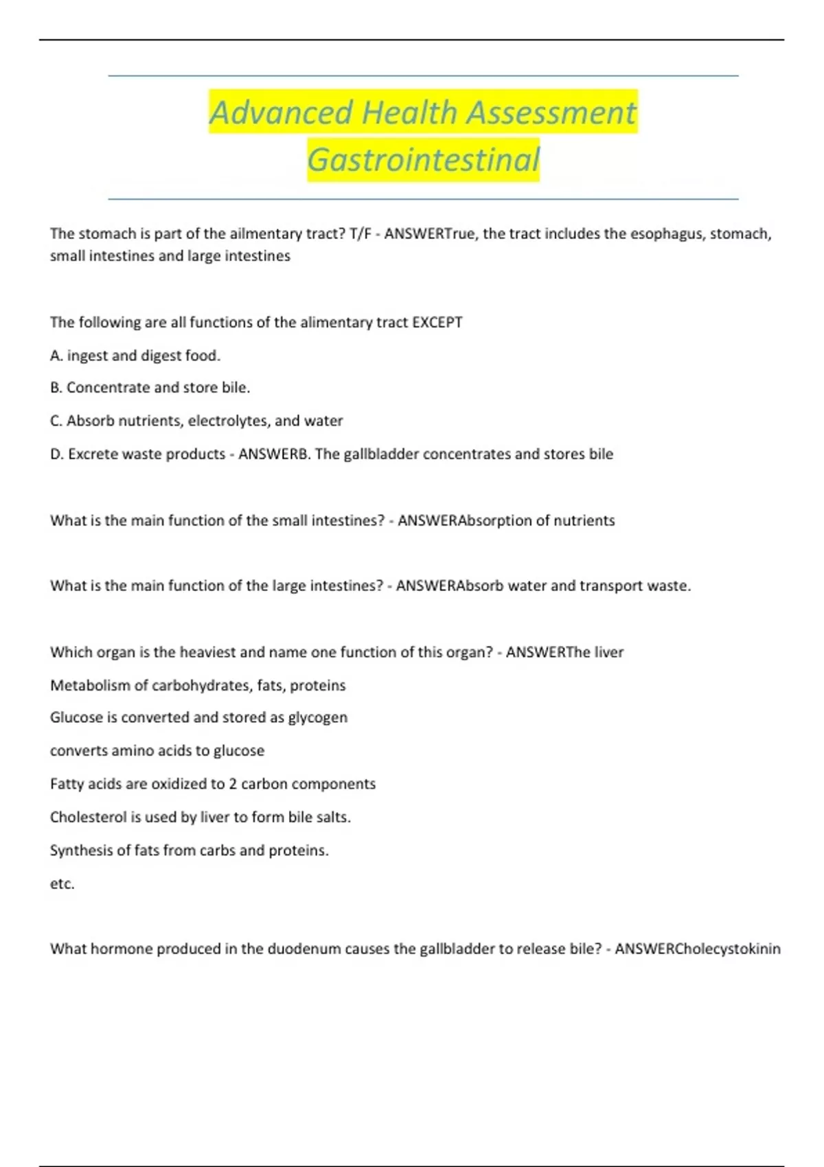 What is the main function of the large intestines? - ANSWERAbsorb water and transport waste.