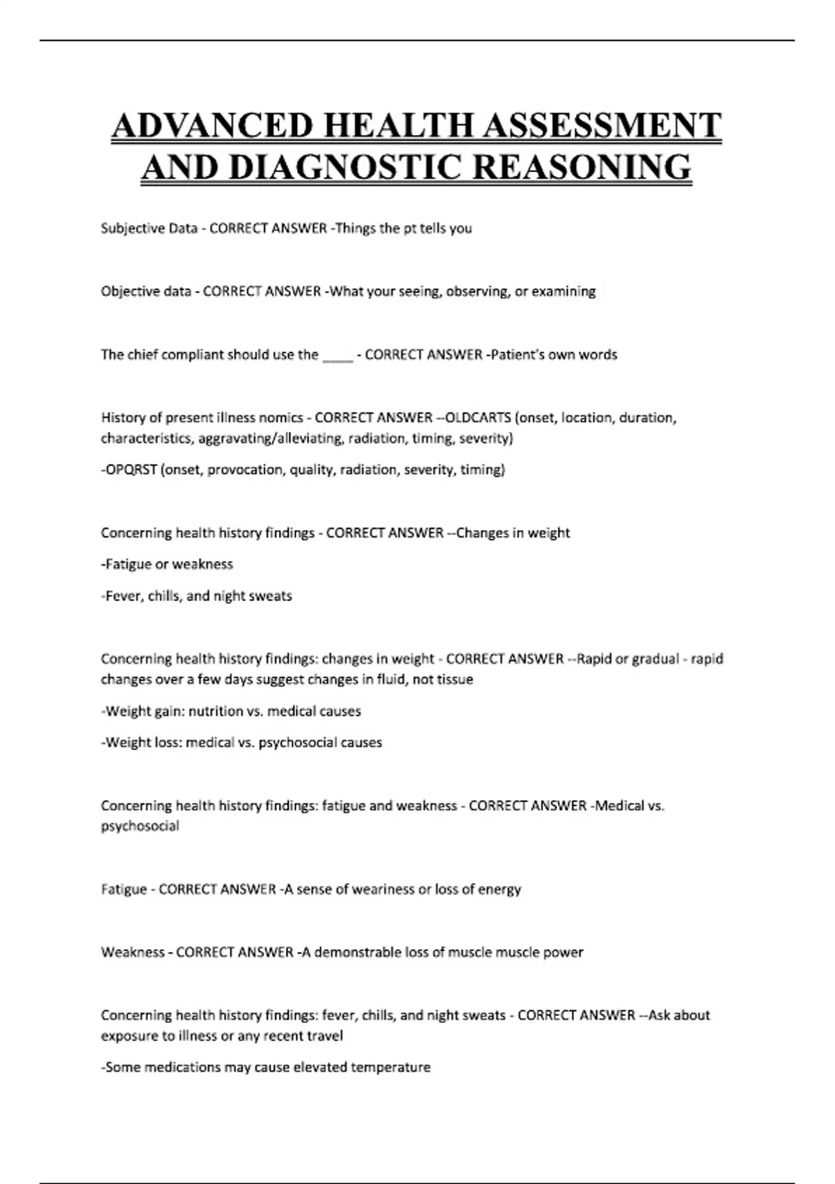 ADVANCED HEALTH ASSESSMENT AND DIAGNOSTIC REASONING Subjective Data - CORRECT ANSWER -Things the pt tells you Objective data - CORRECT ANSWER -What your seeing, observing, or examining The chief compliant should use the ____ - CORRECT ANSWER -Patient's own words History of present illness nomics - CORRECT ANSWER --OLDCARTS (onset, location, duration, characteristics, aggravating/alleviating, radiation, timing, severity) -OPQRST (onset, provocation, quality, radiation, severity, timing) Concerning health history findings - CORRECT ANSWER --Changes in weight -Fatigue or weakness -Fever, chills, and night sweats Concerning health history findings: changes in weight - CORRECT ANSWER --Rapid or gradual - rapid changes over a few days suggest changes in fluid, not tissue -Weight gain: nutrition vs. medical causes -Weight loss: medical vs. psychosocial causes Concerning health history findings: fatigue and weakness - CORRECT ANSWER -Medical vs. psychosocial Fatigue - CORRECT ANSWER -A sense of weariness or loss of energy Weakness - CORRECT ANSWER -A demonstrable loss of muscle muscle power
