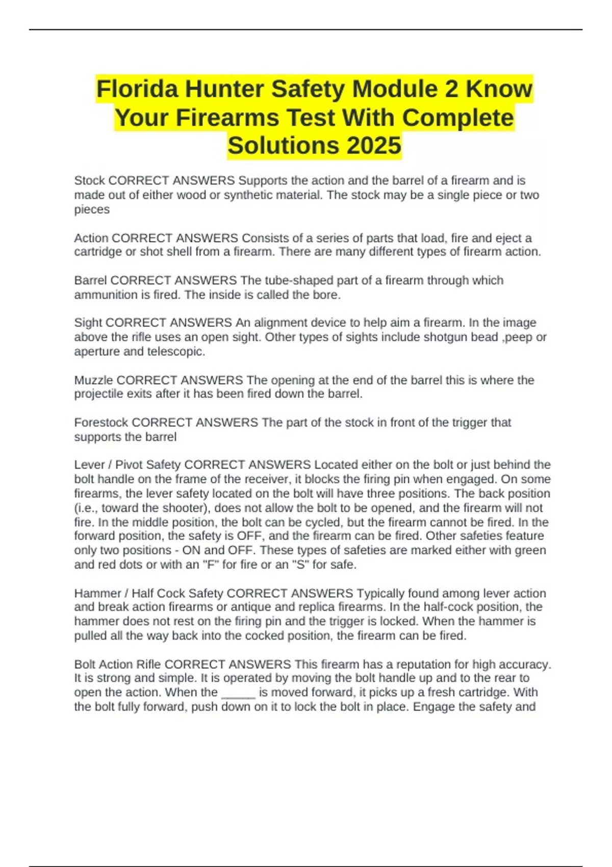 Stock CORRECT ANSWERS Supports the action and the barrel of a firearm and is