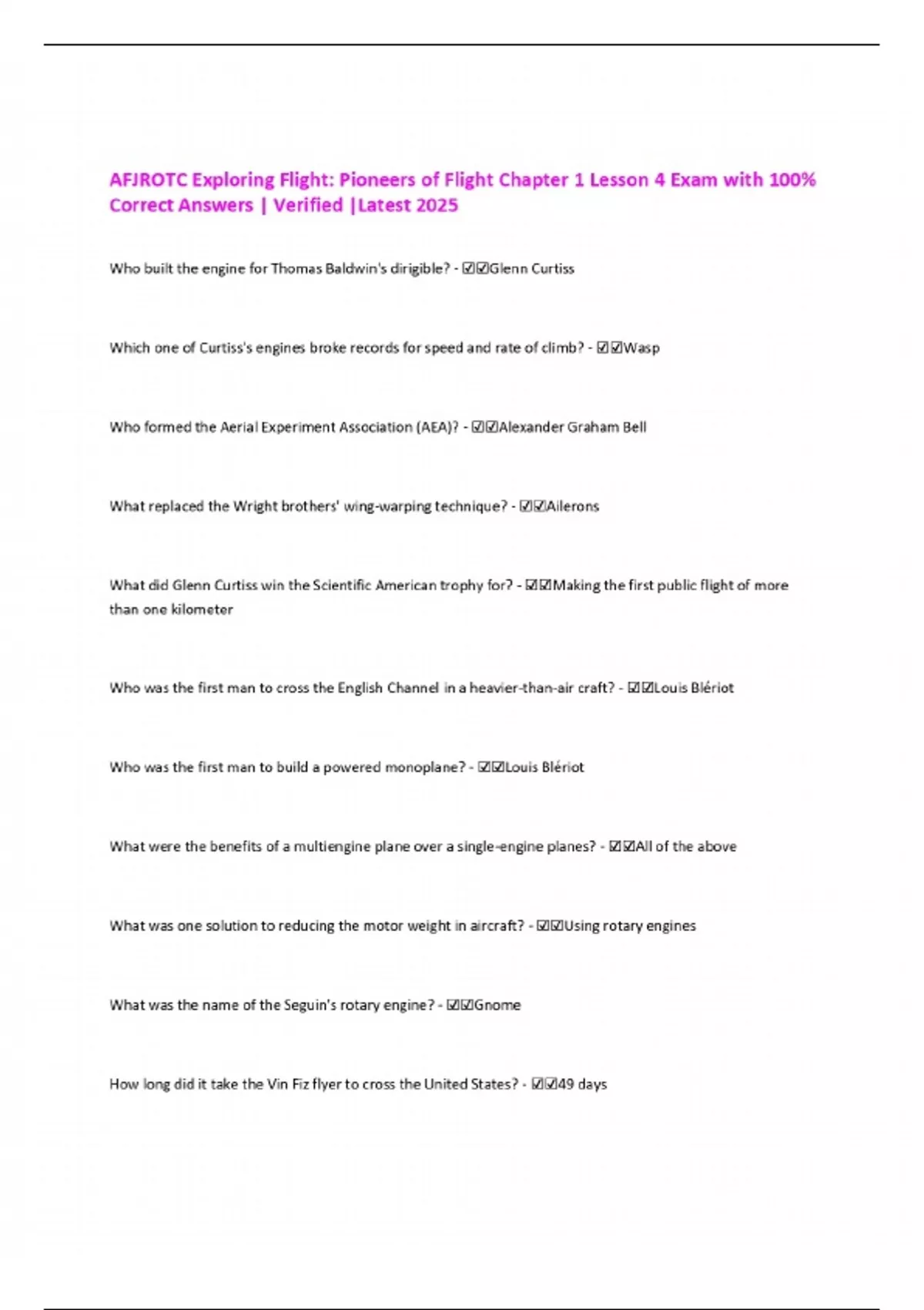 AFJROTC Exploring Flight: Pioneers of Flight Chapter 1 Lesson 4 Exam with 100% Correct Answers | Verified |Latest 2025