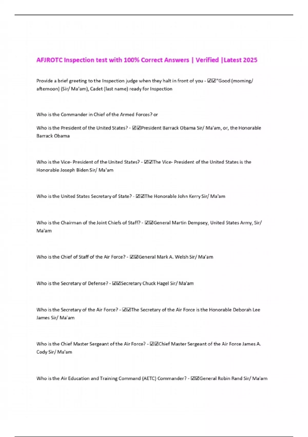 AFJROTC Inspection test with 100% Correct Answers | Verified |Latest 2025