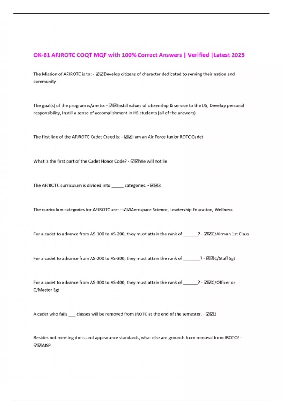 OK-81 AFJROTC COQT MQF with 100% Correct Answers | Verified |Latest 2025