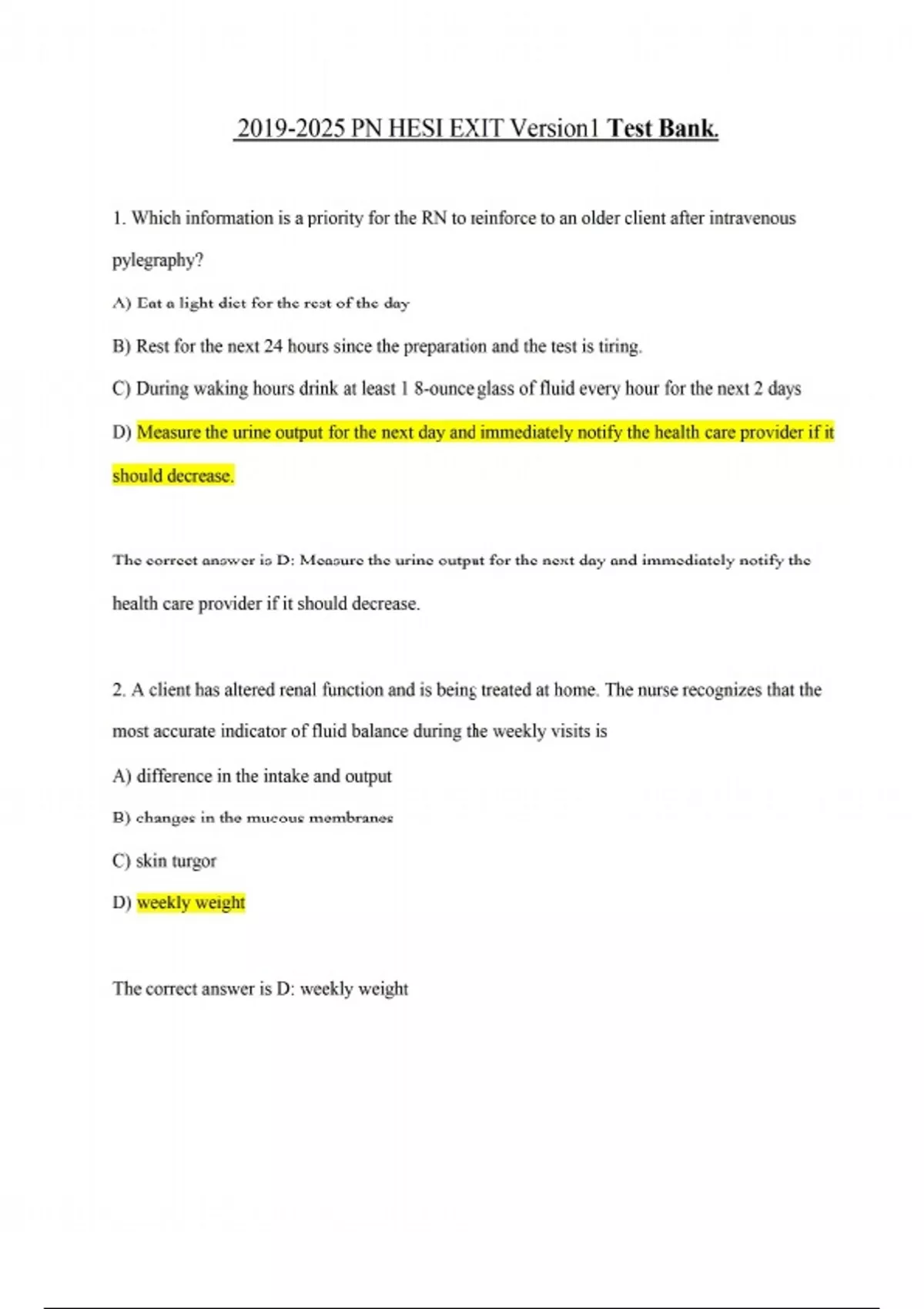 1. Which information is a priority for the RN to reinforce to an older client after intravenous pylegraphy? A) Eat a light diet for the rest of the day B) Rest for the next 24 hours since the preparation and the test is tiring. C) During waking hours drink at least 1 8-ounce glass of fluid every hour for the next 2 days D) Measure the urine output for the next day and immediately notify the health care provider if it should decrease. The correct answer is D: Measure the urine output for the next day and immediately notify the health care provider if it should decrease. 2. A client has altered renal function and is being treated at home. The nurse recognizes that the most accurate indicator of fluid balance during the weekly visits is A) difference in the intake and output B) changes in the mucous membranes C) skin turgor D) weekly weight The correct answer is D: weekly weight 3. A client has been diagnosed with Zollinger-Ellison syndrome.Which information is most important for the nurse to reinforce with the client? A) It is a condition in which one or more tumors called gastrinomas form in the pancreas or in the upper part of the small intestine (duodenum) B) It is critical to report promptly to your health care provider any findings of peptic ulcers c) Treatment consists of medications to reduce acid and heal any peptic ulcers and, if possible, surgery to remove any tumors D) With the average age at diagnosis at 50 years the peptic ulcers may occur at unusual areas of the stomach or intestine The correct answer is B: It is critical to report promptly to your health care provider any findings of peptic ulcers. 4. A primigravida in the third trimester is hospitalized for preeclampsia. The nurse determines that the client’s blood pressure is increasing. Which action should the nurse take first? A) Check the protein level in urine B) Have the client turn to the left side C) Take the temperature D) Monitor the urine output The correct answer is B: Have the client turn to the left side 5. The nurse is caring for a client in atrial fibrillation. The atrial heart rate is 250 and the ventricular rate is controlled at 75. Which of the following findings is cause for the most concern? A) Diminished bowel sounds B) Loss of appetite C) A cold, pale lower leg D) Tachypnea The correct answer is C: A cold, pale lower leg 6. The client with infective endocarditis must be assessed frequently by the home health nurse. Which finding suggests that antibiotic therapy is not effective, and must be reported by the nurse immediately to the healthcare provider? A) Nausea and vomiting B) Fever of 103 degrees Fahrenheit (39.5 degrees Celsius) C) Diffuse macular rash D) Muscle tenderness The correct answer is B: Fever of 103 degrees F (39.5 degrees C) 7. A client who had a vasectomy is in the post recovery unit at an outpatient clinic. Which of these points is most important to be reinforced by the nurse? A) Until the health care provider has determined that your ejaculate doesn't contain sperm, continue to use another form of contraception. B) This procedure doesn't impede the production of male hormones or the production of sperm in the testicles. The sperm can no longer enter your semen and no sperm are in your ejaculate. C) After your vasectomy, strenuous activity needs to be avoided for at least 48 hours. If your work doesn't involve hard physical labor, you can return to your job as soon as you feel up to it. The stitches generally dissolve in seven to ten days. D) The health care provider at this clinic recommends rest, ice, an athletic supporter or over-the- counter pain medication to relieve any discomfort. The correct answer is A: Until the health care provider has determined that your ejaculate doesn't contain sperm, continue to use another form of contraception. 8. A client who is to have antineoplastic chemotherapy tells the nurses of a fear of being sick all the time and wishes to try acupuncture. Which of these beliefs stated by the client would be incorrect about acupuncture? A) Some needles go as deep as 3 inches, depending on where they're placed in the body and what the treatment is for. The needles usually are left in for 15 to 30 minutes. B) In traditional Chinese medicine, imbalances in the basic energetic flow of life — known as qi or chi — are thought to cause illness. C) The flow of life is believed to flow through major pathways or nerve clusters in your body. D) By inserting extremely fine needles into some of the over 400 acupuncture points in various combinations it is believed that energy flow will rebalance to allow the body's natural healing mechanisms to take over. The correct answer is C: The flow of life is believed to flow through major pathways or nerve clusters in your body. 9. The nurse is discussing with a group of students the disease Kawasaki. What statement made by a student about Kawasaki disease is incorrect? A) It also called mucocutaneous lymph node syndrome because it affects the mucous membranes (inside the mouth, throat and nose), skin and lymph nodes. B) In the second phase of the disease, findings include peeling of the skin on the hands and feet with joint and abdominal pain C) Kawasaki disease occurs most often in boys, children younger than age 5 and children of Hispanic descent D) Initially findings are a sudden high fever, usually above 104 degrees Fahrenheit, which lasts 1 to2 weeks The correct answer is C: Kawasaki disease occurs most often in boys, children younger than age 5 and children of Hispanic descent 10. A client has viral pneumonia affecting 2/3 of the right lung. What would be the best position to teach the client to lie in every other hour during first 12 hours after admission? A) Side-lying on the left with the head elevated 10 degrees B) Side-lying on the left with the head elevated 35 degrees C) Side-lying on the right wil the head elevated 10 degrees D) Side-lying on the right with the head elevated 35 degrees The correct answer is A: