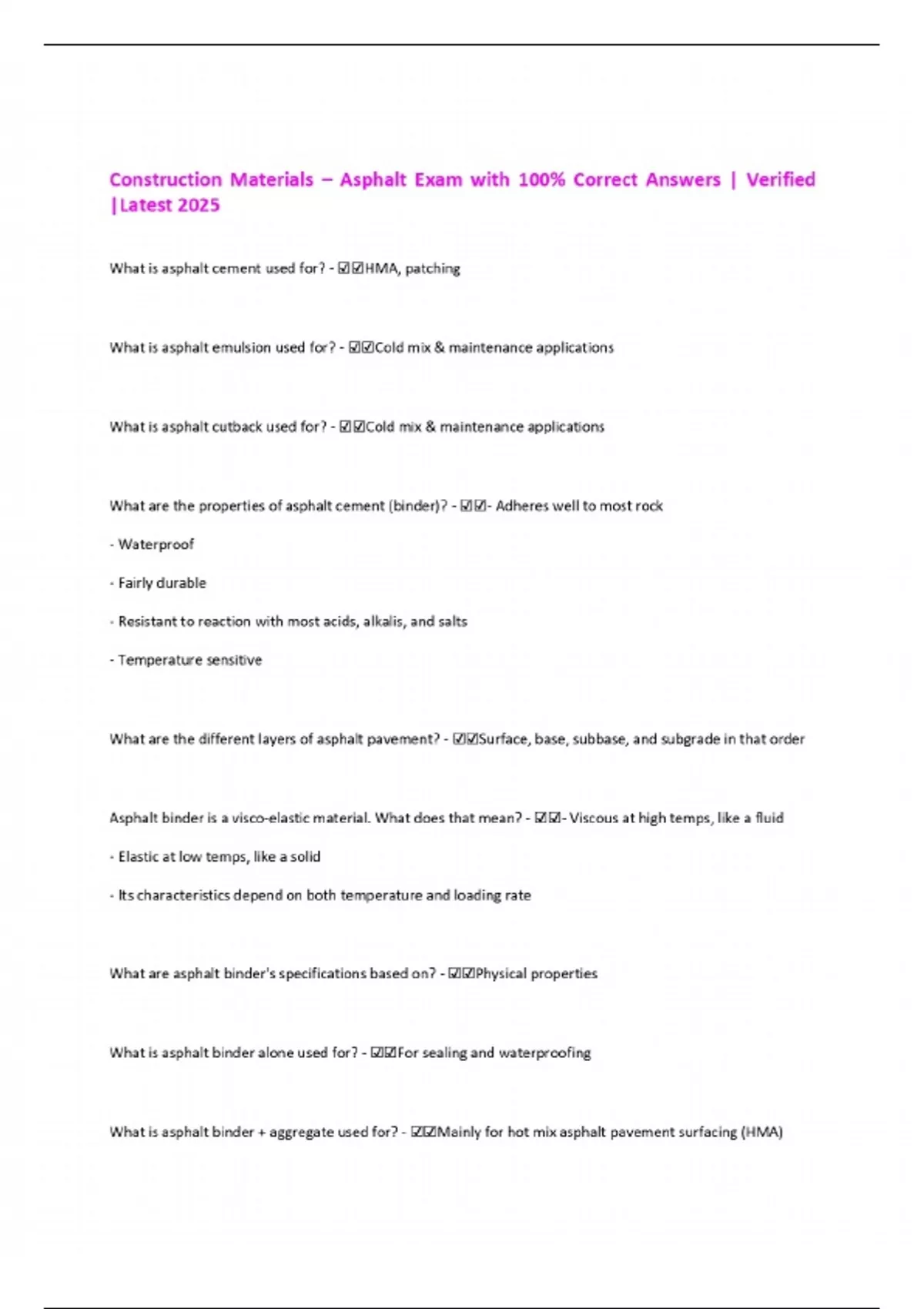 Construction Materials – Asphalt Exam with 100% Correct Answers | Verified |Latest 2025