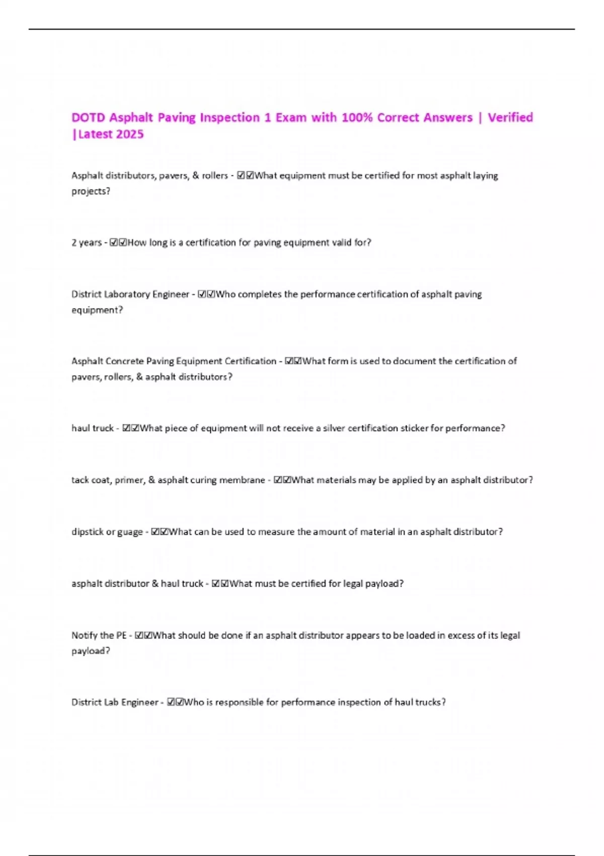 DOTD Asphalt Paving Inspection 1 Exam with 100% Correct Answers | Verified |Latest 2025