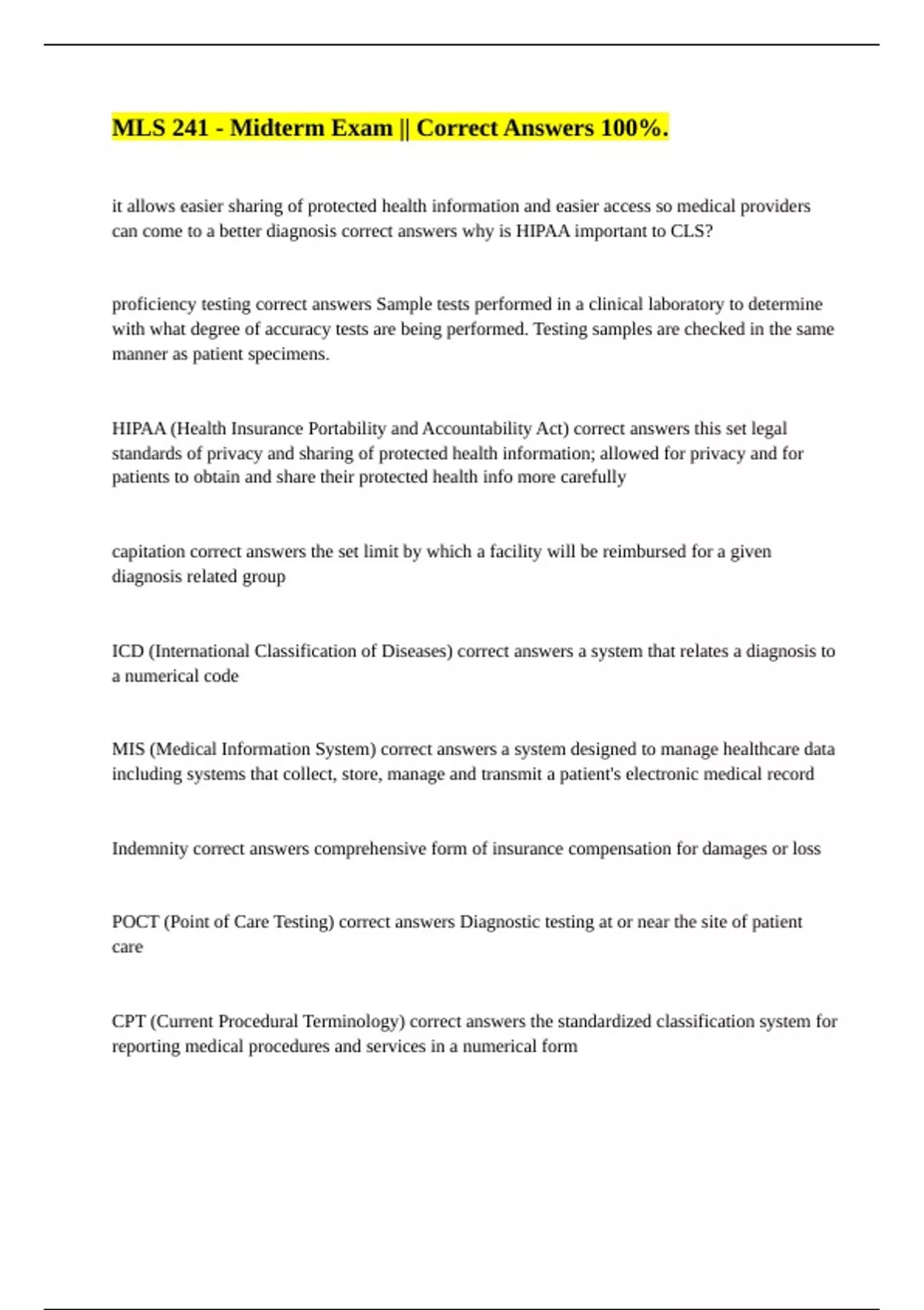 it allows easier sharing of protected health information and easier access so medical providers can come to a better diagnosis correct answers why is HIPAA important to CLS? proficiency testing correct answers Sample tests performed in a clinical laboratory to determine with what degree of accuracy tests are being performed. Testing samples are checked in the same manner as patient specimens. HIPAA (Health Insurance Portability and Accountability Act) correct answers this set legal standards of privacy and sharing of protected health information; allowed for privacy and for patients to obtain and share their protected health info more carefully capitation correct answers the set limit by which a facility will be reimbursed for a given diagnosis related group ICD (International Classification of Diseases) correct answers a system that relates a diagnosis to a numerical code MIS (Medical Information System) correct answers a system designed to manage healthcare data including systems that collect, store, manage and transmit a patient's electronic medical record Indemnity correct answers comprehensive form of insurance compensation for damages or loss POCT (Point of Care Testing) correct answers Diagnostic testing at or near the site of patient care CPT (Current Procedural Terminology) correct answers the standardized classification system for reporting medical procedures and services in a numerical form