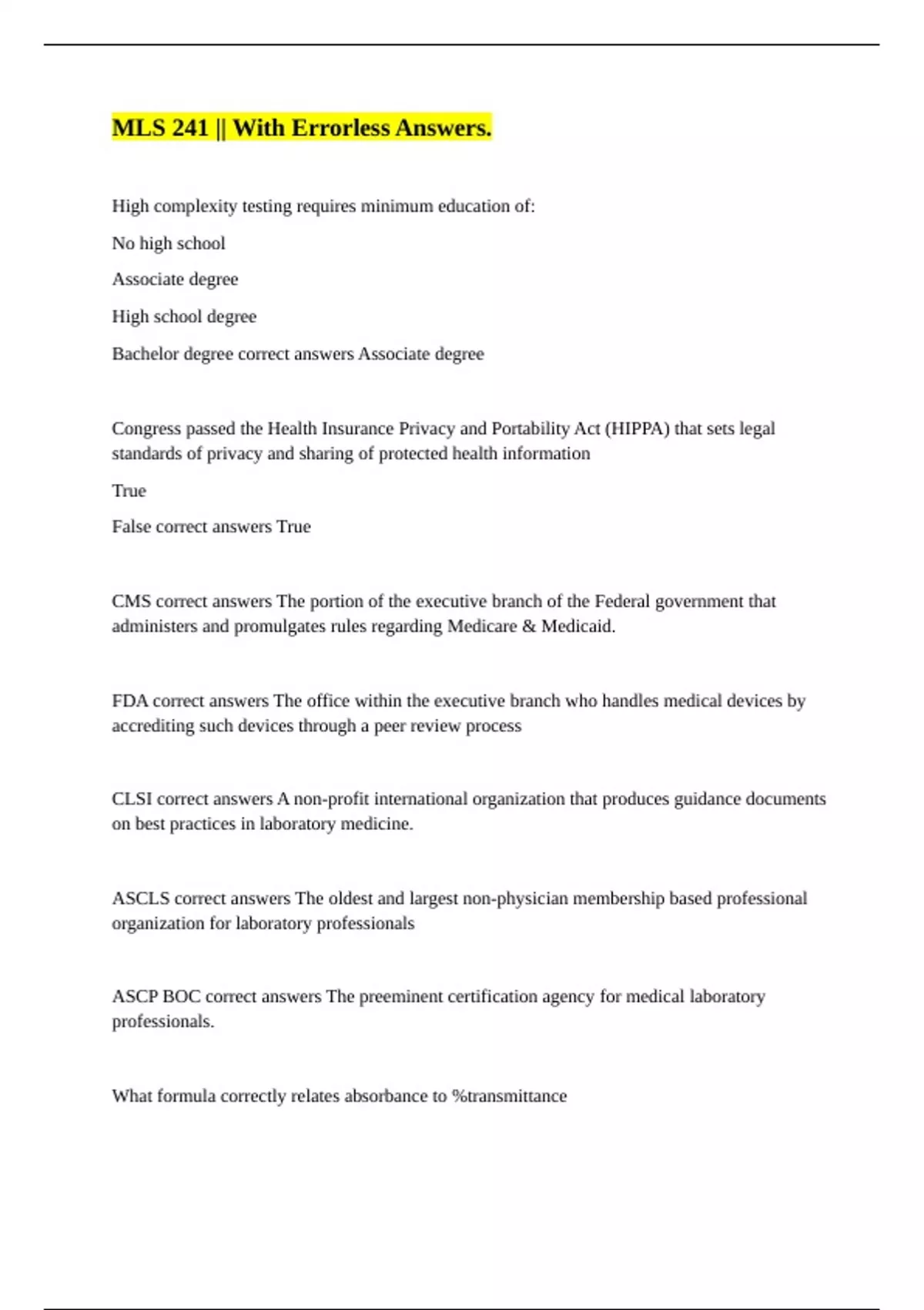 High complexity testing requires minimum education of: No high school Associate degree High school degree Bachelor degree correct answers Associate degree Congress passed the Health Insurance Privacy and Portability Act (HIPPA) that sets legal standards of privacy and sharing of protected health information True False correct answers True CMS correct answers The portion of the executive branch of the Federal government that administers and promulgates rules regarding Medicare & Medicaid. FDA correct answers The office within the executive branch who handles medical devices by accrediting such devices through a peer review process CLSI correct answers A non-profit international organization that produces guidance documents on best practices in laboratory medicine. ASCLS correct answers The oldest and largest non-physician membership based professional organization for laboratory professionals ASCP BOC correct answers The preeminent certification agency for medical laboratory professionals. What formula correctly relates absorbance to %transmittance