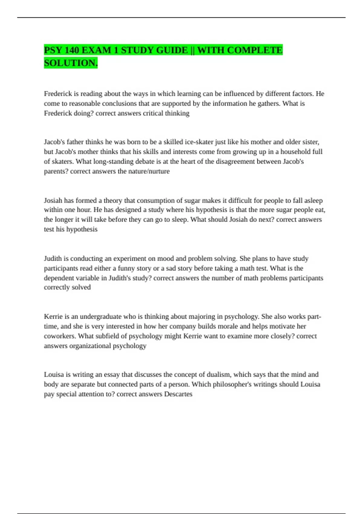 Frederick is reading about the ways in which learning can be influenced by different factors. He come to reasonable conclusions that are supported by the information he gathers. What is Frederick doing? correct answers critical thinking Jacob's father thinks he was born to be a skilled ice-skater just like his mother and older sister, but Jacob's mother thinks that his skills and interests come from growing up in a household full of skaters. What long-standing debate is at the heart of the disagreement between Jacob's parents? correct answers the nature/nurture Josiah has formed a theory that consumption of sugar makes it difficult for people to fall asleep within one hour. He has designed a study where his hypothesis is that the more sugar people eat, the longer it will take before they can go to sleep. What should Josiah do next? correct answers test his hypothesis Judith is conducting an experiment on mood and problem solving. She plans to have study participants read either a funny story or a sad story before taking a math test. What is the dependent variable in Judith's study? correct answers the number of math problems participants correctly solved Kerrie is an undergraduate who is thinking about majoring in psychology. She also works part-time, and she is very interested in how her company builds morale and helps motivate her coworkers. What subfield of psychology might Kerrie want to examine more closely? correct answers organizational psychology Louisa is writing an essay that discusses the concept of dualism, which says that the mind and body are separate but connected parts of a person. Which philosopher's writings should Louisa pay special attention to? correct answers Descartes