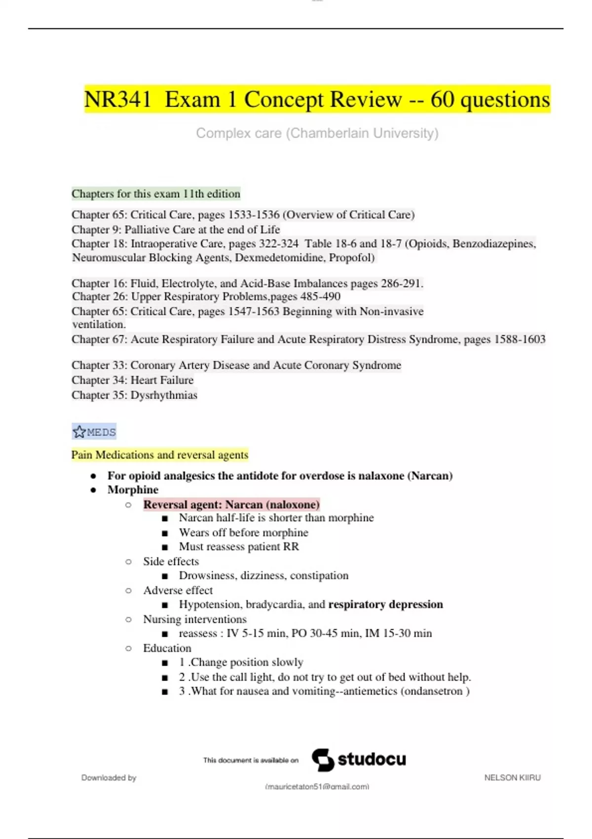 NR341 Exam 1 Concept Review -- 60 questions Complex care (Chamberlain University) Pain Medications and reversal agents ● For opioid analgesics the antidote for overdose is nalaxone (Narcan) ● Morphine ○ Reversal agent: Narcan (naloxone) ■ Narcan half-life is shorter than morphine ■ Wears off before morphine ■ Must reassess patient RR ○ Side effects ■ Drowsiness, dizziness, constipation ○ Adverse effect ■ Hypotension, bradycardia, and respiratory depression ○ Nursing interventions ■ reassess : IV 5-15 min, PO 30-45 min, IM 15-30 min ○ Education ■ 1 .Change position slowly ■ 2 .Use the call light, do not try to get out of bed without help. ■ 3 .What for nausea and vomiting--antiemetics (ondansetron ● Benzodiazepines ○ Sedative -- NO ANALGESIC EFFECTS ○ Used for ventilator/anesthesia adjunct ○ AE: Monitor for respiratory depression ○ Reversal: flumazenil (Romazicon)