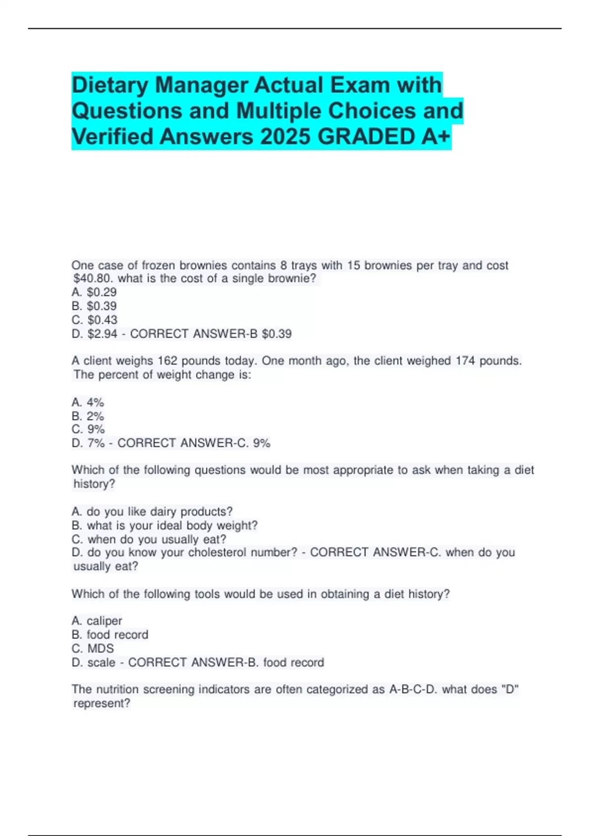 Dietary Manager Actual Exam with Questions and Multiple Choices and Verified Answers 2025 GRADED A+