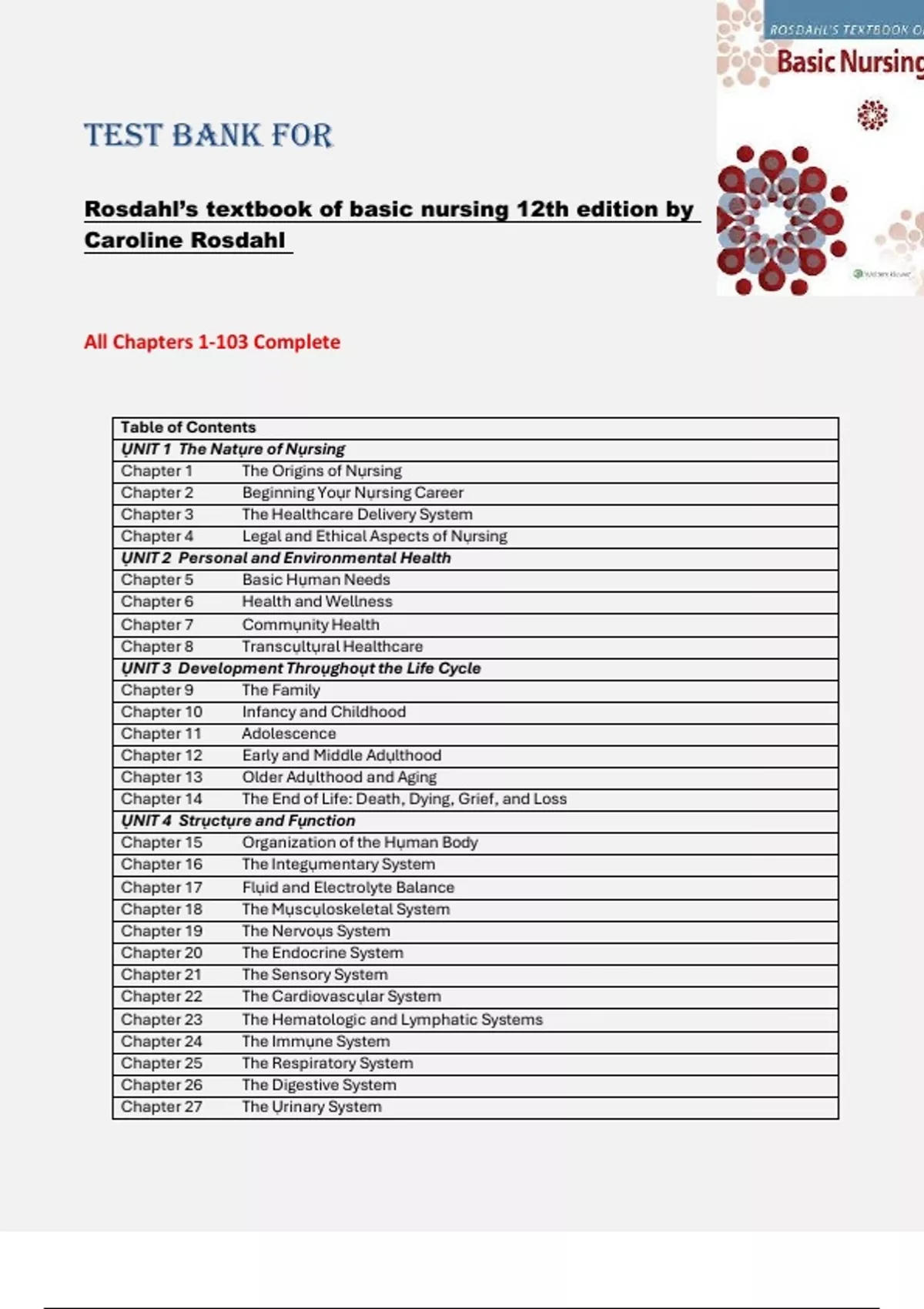 Rosdahl’s Textbook of Basic Nursing (12th Edition) by Caroline Rosdahl – Complete Test Bank for Chapters 1–103