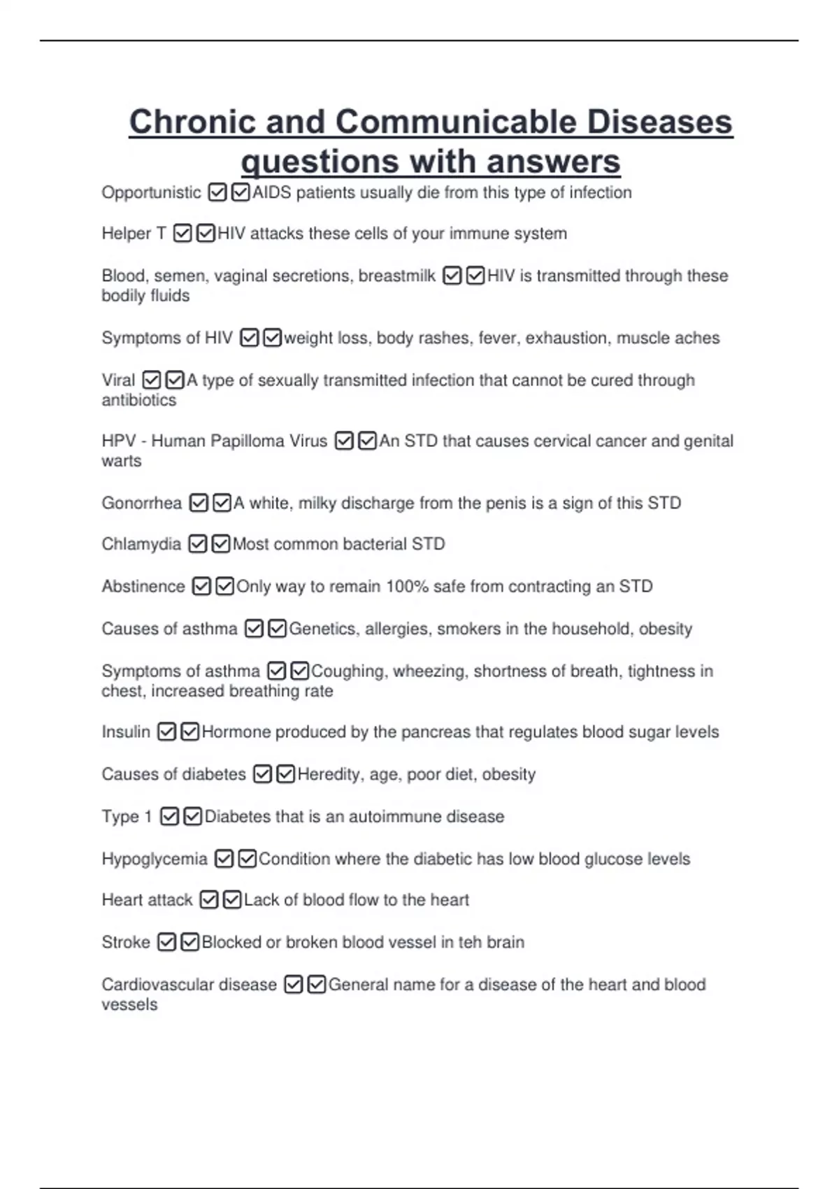 Chronic and Communicable Diseases questions with answers Opportunistic AIDS patients usually die from this type of infection Helper T HIV attacks these cells of your immune system Blood, semen, vaginal secretions, breastmilk HIV is transmitted through these bodily fluids