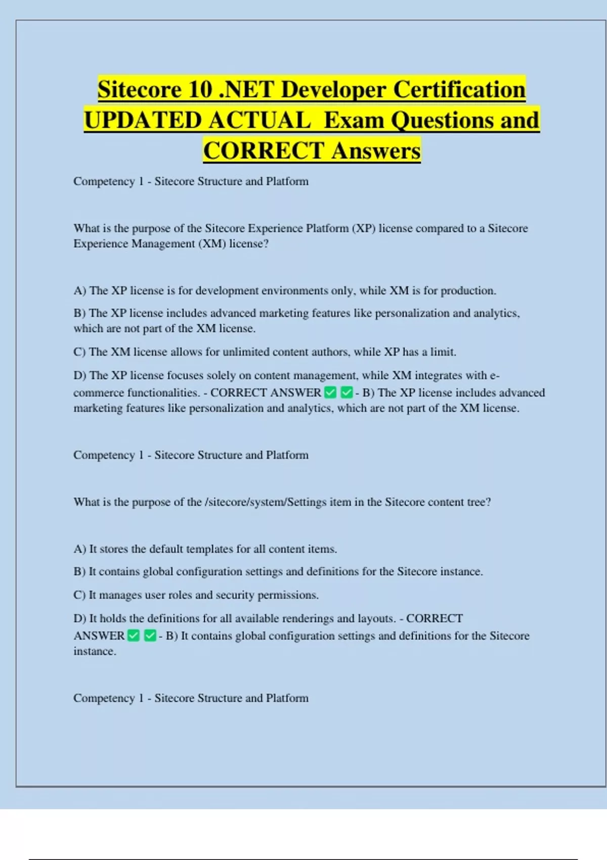 Sitecore 10 .NET Developer Certification UPDATED ACTUAL Exam Questions and CORRECT Answers Competency 1 - Sitecore Structure and Platform What is the purpose of the Sitecore Experience Platform (XP) license compared to a Sitecore Experience Management (XM) license? A) The XP license is for development environments only, while XM is for production. B) The XP license includes advanced marketing features like personalization and analytics, which are not part of the XM license. C) The XM license allows for unlimited content authors, while XP has a limit. D) The XP license focuses solely on content management, while XM integrates wi