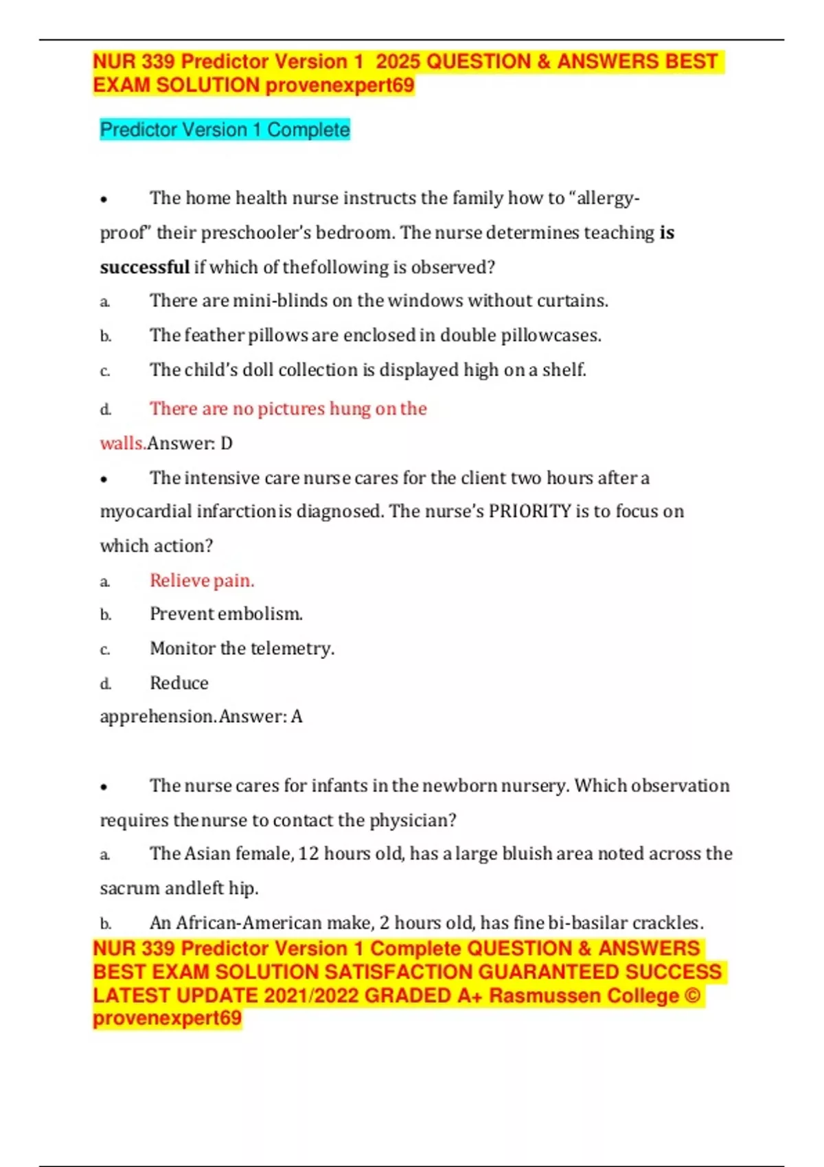 NUR 339 Predictor Version 1 2025 QUESTION & ANSWERS BEST EXAM SOLUTION provenexpert69 • The home health nurse instructs the family how to “allergy-proof” their preschooler’s bedroom. The nurse determines teaching is successful if which of the following is observed? a. There are mini-blinds on the windows without curtains. b. The feather pillows are enclosed in double pillowcases. c. The child’s doll collection is displayed high on a shelf. d. There are no pictures hung on the walls. Answer: D