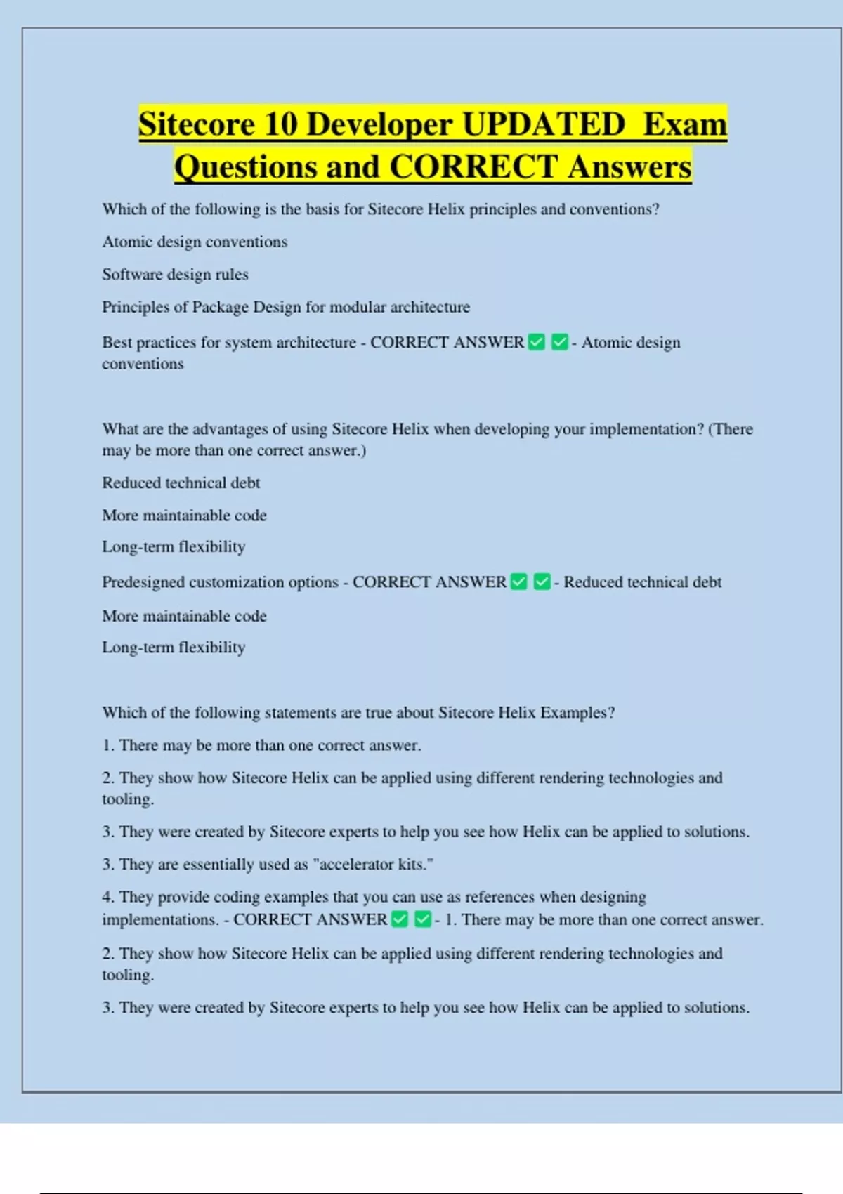 Sitecore 10 Developer UPDATED Exam Questions and CORRECT Answers Which of the following is the basis for Sitecore Helix principles and conventions? Atomic design conventions Software design rules Principles of Package Design for modular architecture Best practices for system architecture - CORRECT ANSWER conventions - Atomic design What are the advantages of using Sitecore Helix when developing your implementation? (Th