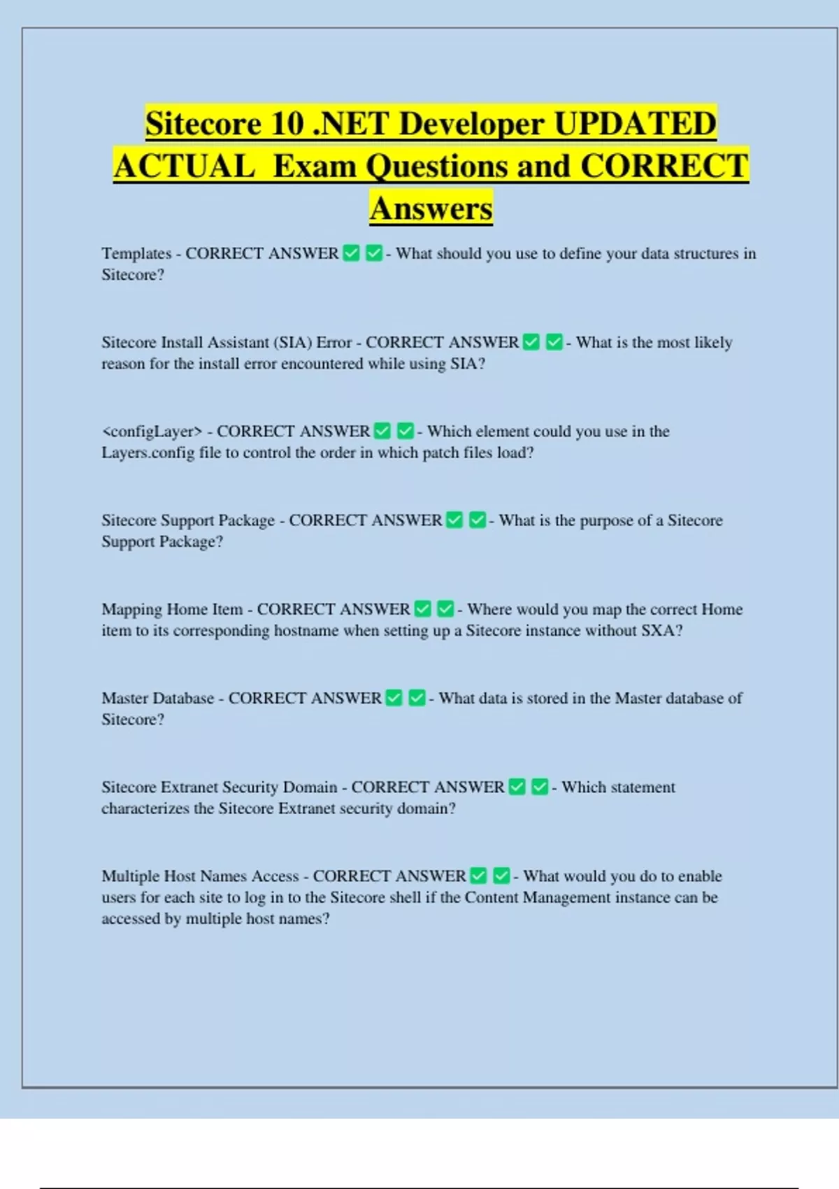 Sitecore 10 .NET Developer UPDATED ACTUAL Exam Questions and CORRECT Answers Templates - CORRECT ANSWER Sitecore? - What should you use to define your data structures in Sitecore Install Assistant (SIA) Error - CORRECT ANSWER reason for the install error encountered while using SIA? configLayer - CORRECT ANSWER - What is the most likely - Which element could you use in the Lg file to control the order in which patch files load? Sitecore Support Package - CORRECT ANSWER Support Package? Mapping Home Item - CORRECT ANSWER - What is the purpose of a Sitecore