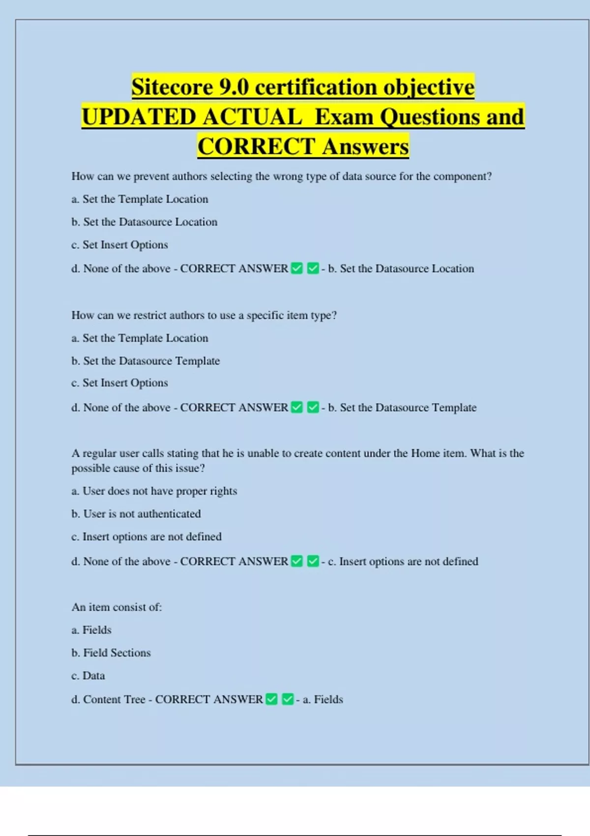 Sitecore 9.0 certification objective UPDATED ACTUAL Exam Questions and CORRECT Answers How can we prevent authors selecting the wrong type of data source for the component? a. Set the Template Location b. Set the Datasource Location c. Set Insert Options d. None of the above - CORRECT ANSWER - b. Set the Datasource Location How can we restrict authors to use a specific item typ