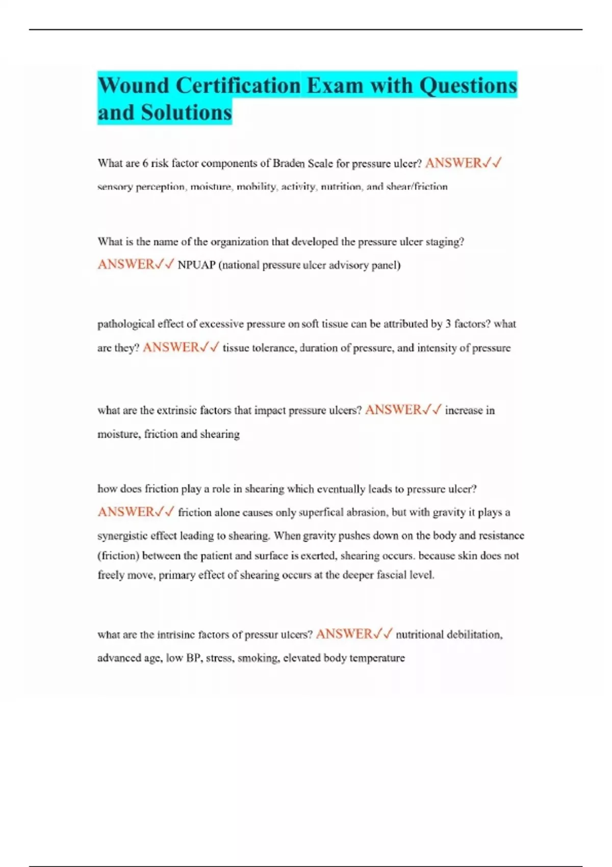 Wound Certification Exam with Questions and Solutions What are 6 risk factor components of Braden Scale for pressure ulcer? ANSWER sensory perception, moisture, mobility, activity, nutrition, and shear/friction What is the name of the organization that developed the pressure ulcer staging? ANSWER NPUAP (national pressure ulcer advisory panel) pathological effect of excessive pressure on soft tissue can be attributed by 3 factors? what are they? ANSWER tissue tolerance, duration of pressure, and intensity of pressure what are the extrinsic factors that impact pressure ulcers? ANSWER increase in moisture, friction and shearing how does friction play a role in shearing which eventually leads to pressure ulcer? ANSWER friction alone causes only superfical abrasion, but with gravity it plays a synergistic effect leading to shearing. When gravity pushes down on the body and resistance (friction) between the patient and surface is exerted, shearing occurs. because skin does not freely move, primary effect of shearing occurs at the deeper fascial level. what are the intrisinc factors of pressur ulcers? ANSWER nutritional debilitation, advanced age, low BP, stress, smoking, elevated body temperature