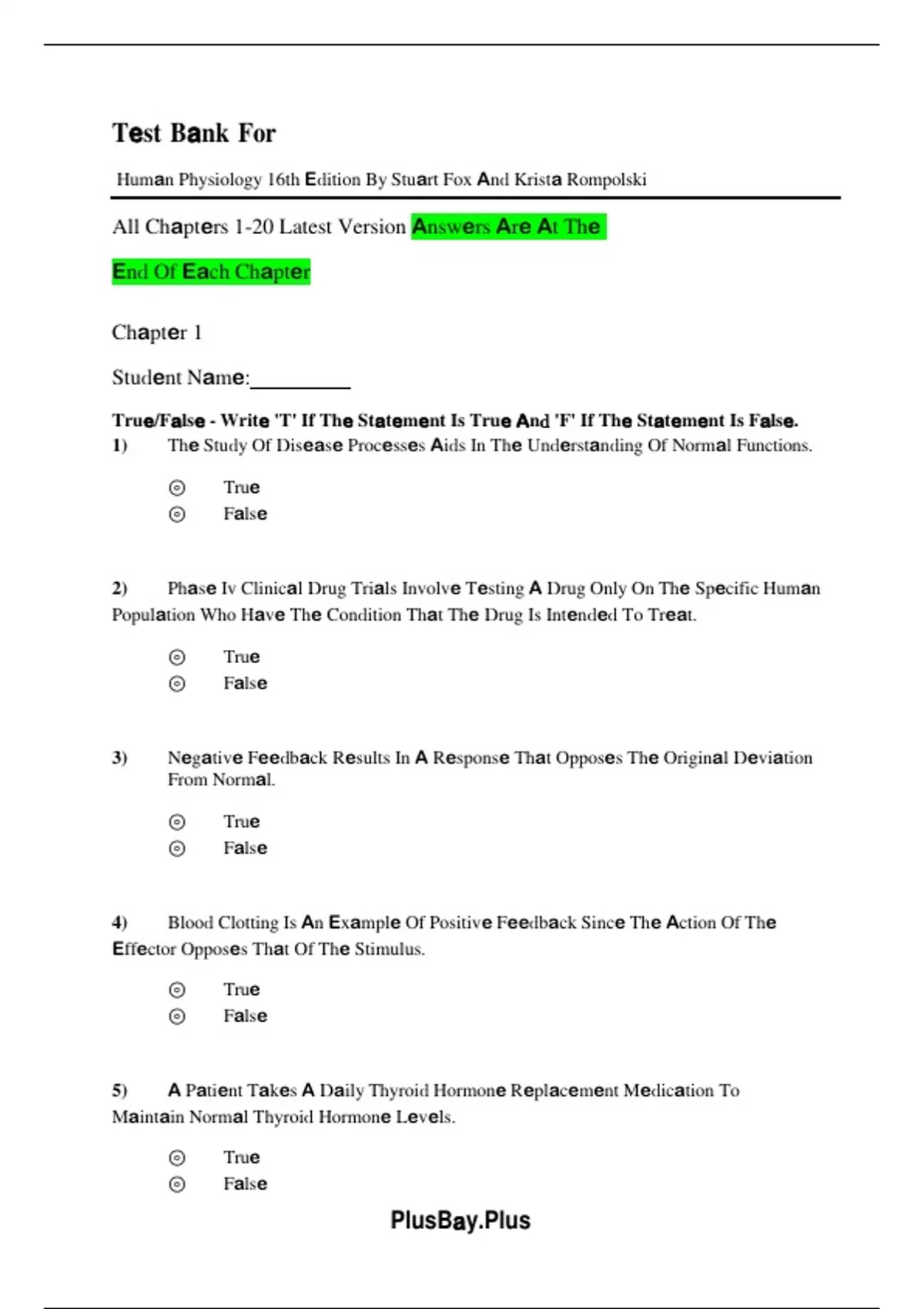 Test Bank For Human Physiology 16th Edition By Stuart Fox And Krista Rompolski All Chapters 1-20 Latest Version