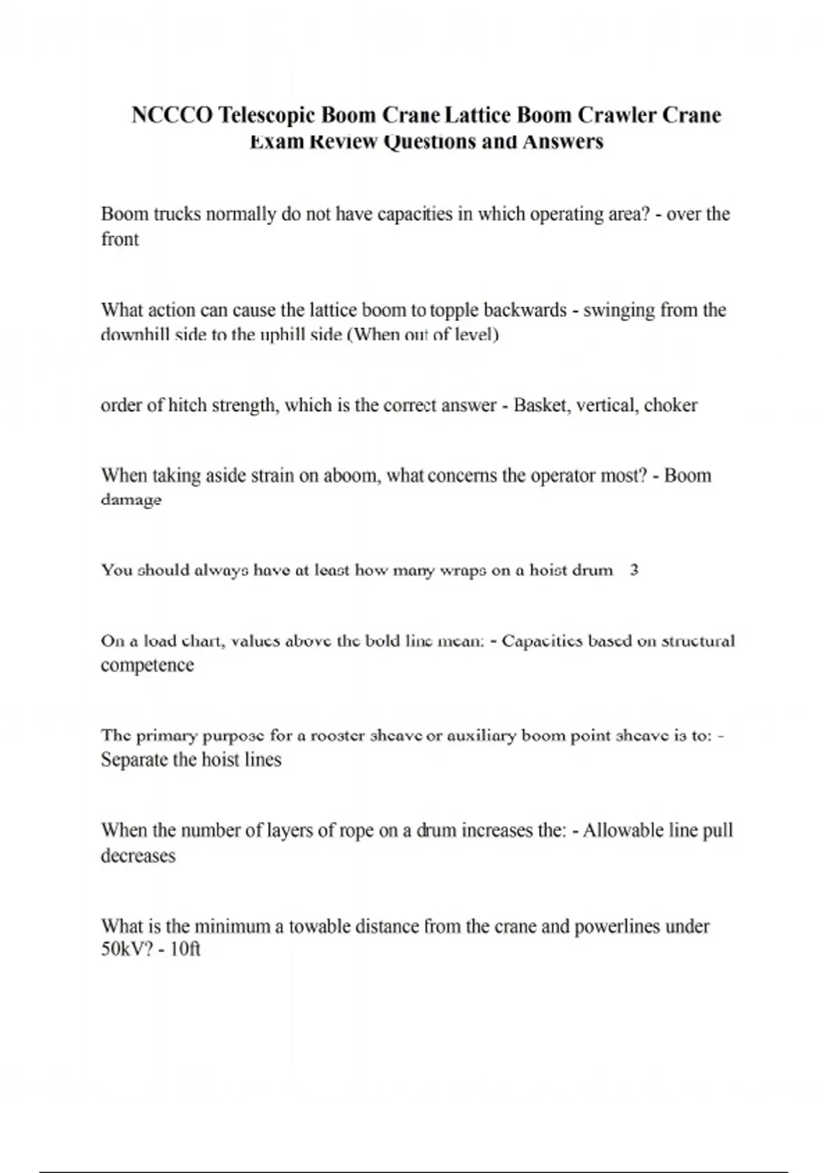 Side loading may be caused by - Starting or stopping the swing too rapidly Eccentric main boom tip reeving causes: - Twisting of the boom How many randomly broken wires must there be ot remove a running wire rope from service - 6 What is the safety factor required when using non-rotating wire rope and lifting personnel in a man basket - 10 Who has the responsibility for determining the correct weight of a load - Supervisor According ot ANSI B30.5 personnel pla form lifts should not be made with wind in excess of: - 200mph During set up how do you determine machine clearances (counterweight. boom. outrigger - Load chart When operating a crawler crane, what si the most unstable allowable quadrant of operation - Side When operating a truck crane, what si hte most unstable allowable quadrant of operation - Front What is not a good location for crane set up? - Above utilities When should a tagline be used? - When rotation of load would be dangerous