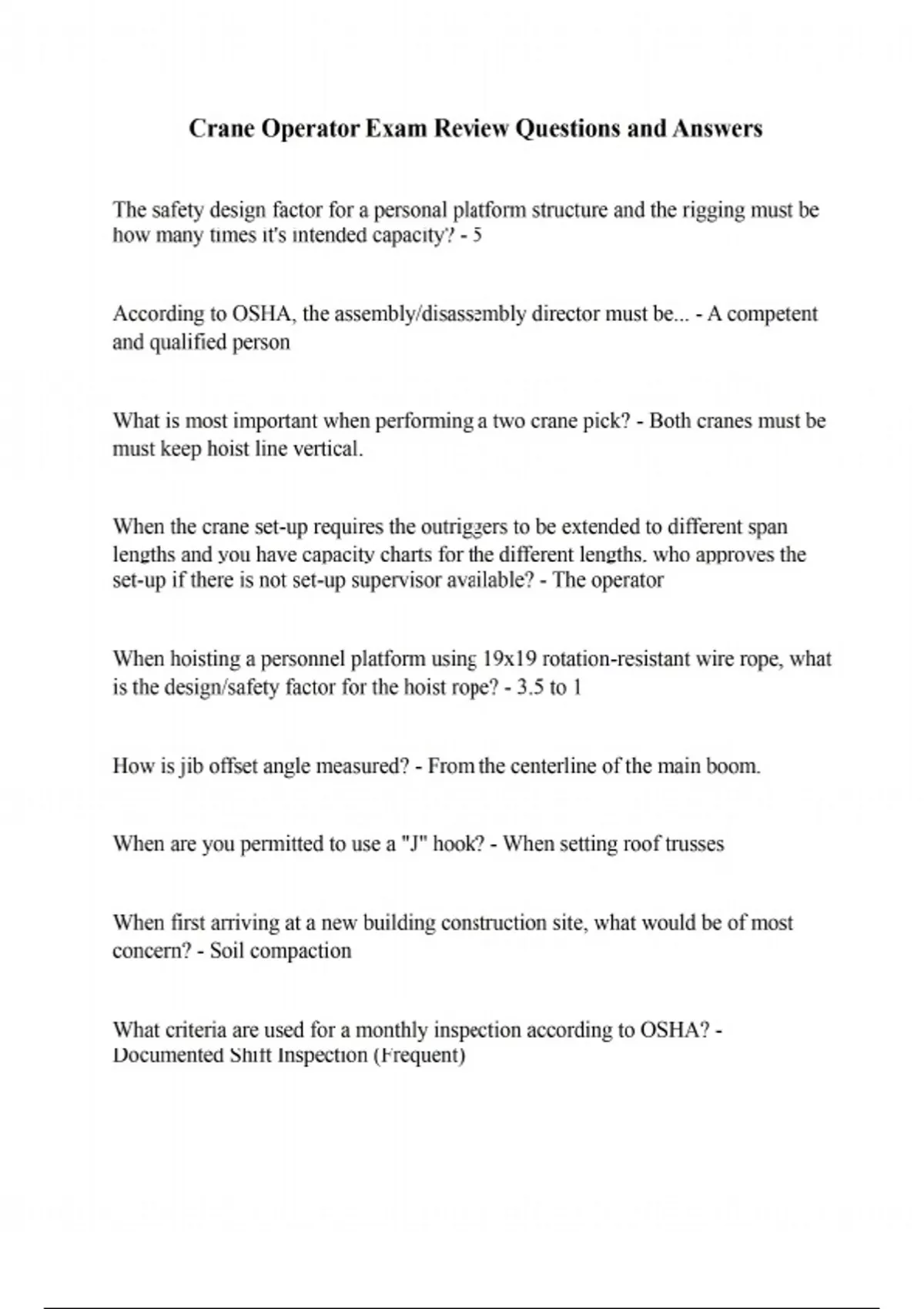 On wheel mounted cranes, the required distance to stop at 15 mph is: - 32 feet According to ASME B30.5, when working near power lines up to 350kV and the actual voltage level is not known how far must you stay away from the lines? - 20 feet OSHA and ASME regulations require any part of the crane to be how far from a 230kV power line? - 20 feet What would you do to prevent a load from swinging away from the crane when picking up a heavy load? - Raise the boom slightly to compensate for boom deflection before hoisting the load. According to ASME, crawler brakes or lock must be able to... - apply in the event of loss of operating pressure or power. How many randomly broken wires in regular lay running wire rope require the wire rope to be removed from service? - 6 What is dynamic loading? - A load introduced to a crane by accelerating and decelerating forces in any direction. What rigging hardware device is restricted to a minimum horizontal sling angle of 45 degrees? - A hook When putting a mobile crane on a barge, what is the maximum allowable barge list? - 5 degrees or what the manufacturer or the qualified person indicates, whichever is less.