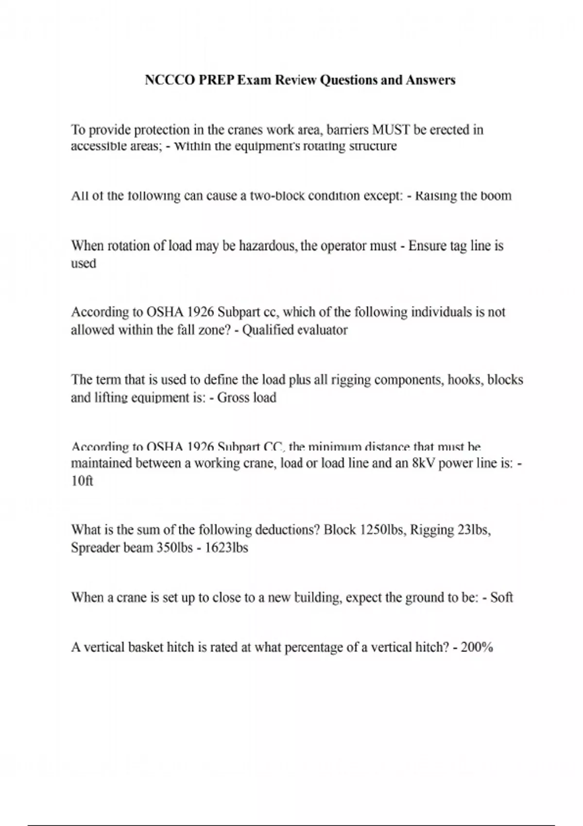 When is the hoist line on top of the boom considered part of the load? - It is not considered When a heavy load is lifted, what is the result? - Boom deflection According to OSHA 1926 Subpart CC, for cranes traveling with no load, what is the minimum clearance for energized power lines at 40kV? - 6ft Wich of the following rigging configurations is listed in order of the strongest to weakest? - Basket, Vertical, Choker According to OSHA 1926 Subpart CC, how many randomly distributed broken wires in rotation resistant wire rope are cause for replacement? - 2 broken wires in 6 rope diameters What site conditions must an operator be concerned about prior to setting up a crane? - Soil stability must be sufficient The best way to determine the weight of load to be lifted is to: - Have certified load weight and add in the weight of all the rigging What source should be used to determine boom tip height? - Working range diagram In order for an overhead power line to be considered de-energized it must be verified by the: - Line owner The purpose of the load moment indicator is to: - Warn the operator of an overload condition