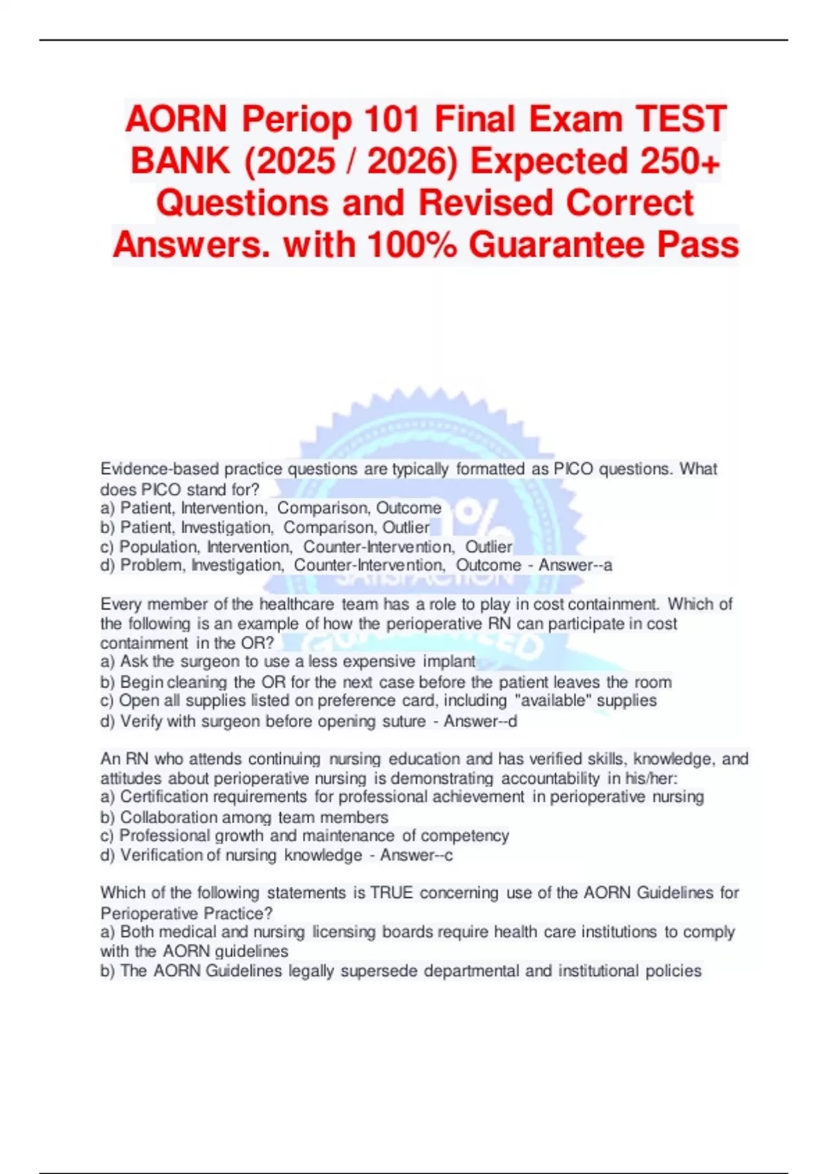Evidence-based practice questions are typically formatted as PICO questions. What does PICO stand for? a) Patient, Intervention, Comparison, Outcome b) Patient, Investigation, Comparison, Outlier c) Population, Intervention, Counter-Intervention, Outlier d) Problem, Investigation, Counter-Intervention, Outcome - Answer--a Every member of the healthcare team has a role to play in cost containment. Which of the following is an example of how the perioperative RN can participate in cost containment in the OR? a) Ask the surgeon to use a less expensive implant b) Begin cleaning the OR for the next case before the patient leaves the room c) Open all supplies listed on preference card, including "available" supplies d) Verify with surgeon before opening suture - Answer--d An RN who attends continuing nursing education and has verified skills, knowledge, and attitudes about perioperative nursing is demonstrating accountability in his/her: a) Certification requirements for professional achievement in perioperative nursing b) Collaboration among team members c) Professional growth and maintenance of competency d) Verification of nursing knowledge - Answer--c Which of the following statements is TRUE concerning use of the AORN Guidelines for Perioperative Practice? a) Both medical and nursing licensing boards require health care institutions to comply with the AORN guidelines b) The AORN Guidelines legally supersede departmental and institutional policies