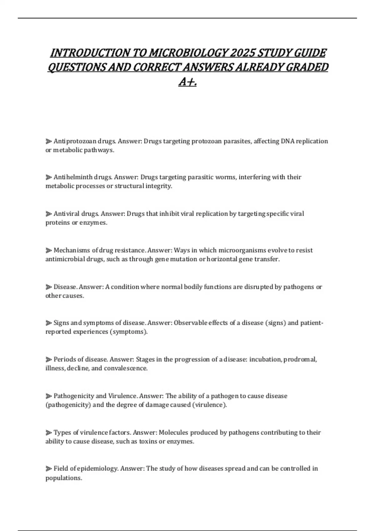 ⫸ Antiprotozoan drugs. Answer: Drugs targeting protozoan parasites, affecting DNA replication or metabolic pathways. ⫸ Antihelminth drugs. Answer: Drugs targeting parasitic worms, interfering with their metabolic processes or structural integrity. ⫸ Antiviral drugs. Answer: Drugs that inhibit viral replication by targeting specific viral proteins or enzymes. ⫸ Mechanisms of drug resistance. Answer: Ways in which microorganisms evolve to resist antimicrobial drugs, such as through gene mutation or horizontal gene transfer. ⫸ Disease. Answer: A condition where normal bodily functions are disrupted by pathogens or other causes. ⫸ Signs and symptoms of disease. Answer: Observable effects of a disease (signs) and patient reported experiences (symptoms). ⫸ Periods of disease. Answer: Stages in the progression of a disease: incubation, prodromal, illness, decline, and convalescence. ⫸ Pathogenicity and Virulence. Answer: The ability of a pathogen to cause disease (pathogenicity) and the degree of damage caused (virulence). ⫸ Types of virulence factors. Answer: Molecules produced by pathogens contributing to their ability to cause disease, such as toxins or enzymes. ⫸ Field of epidemiology. Answer: The study of how diseases spread and can be controlled in populations.