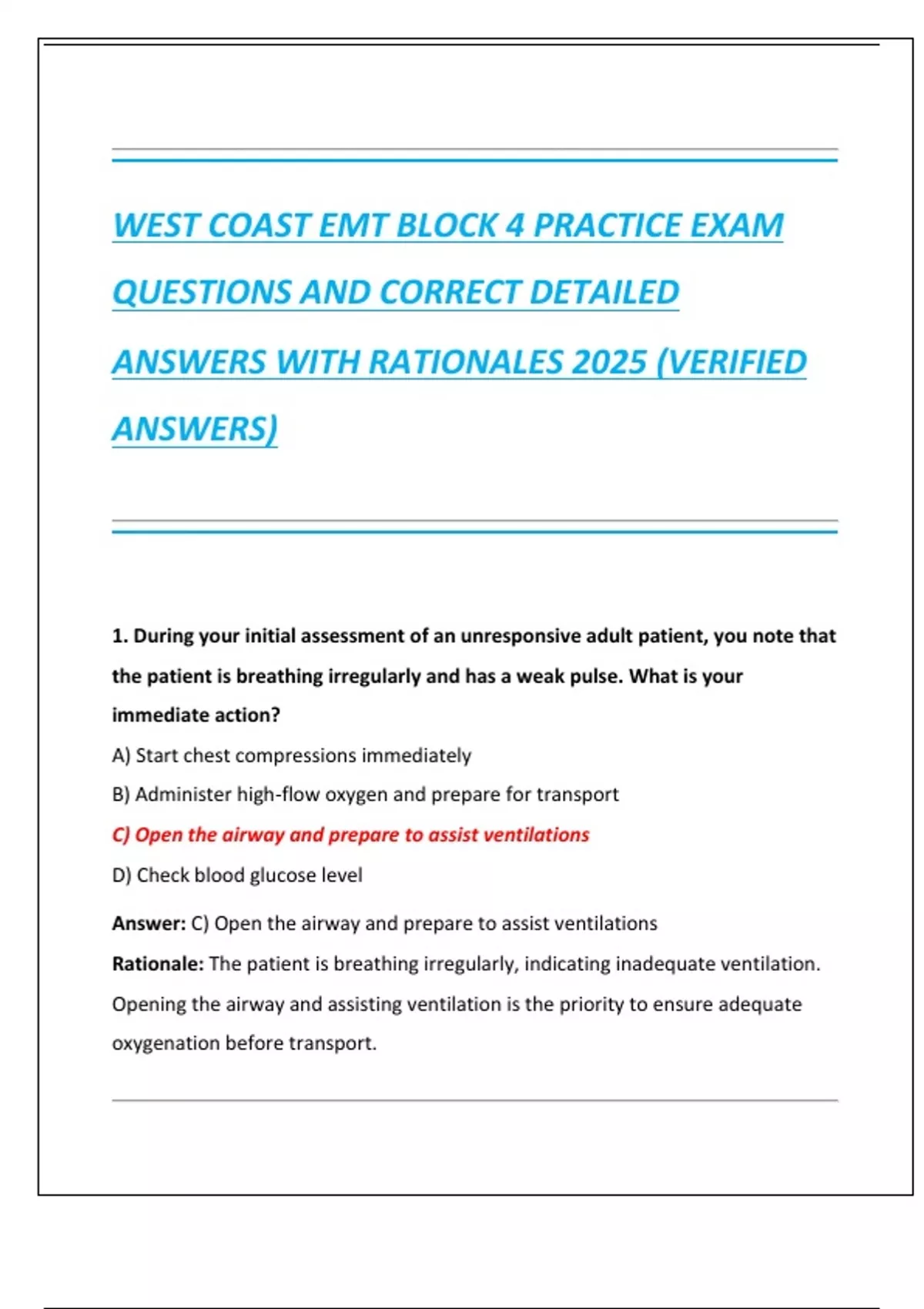 WEST COAST EMT BLOCK 4 PRACTICE EXAM QUESTIONS AND CORRECT DETAILED ANSWERS WITH RATIONALES 2025 (VERIFIED ANSWERS)