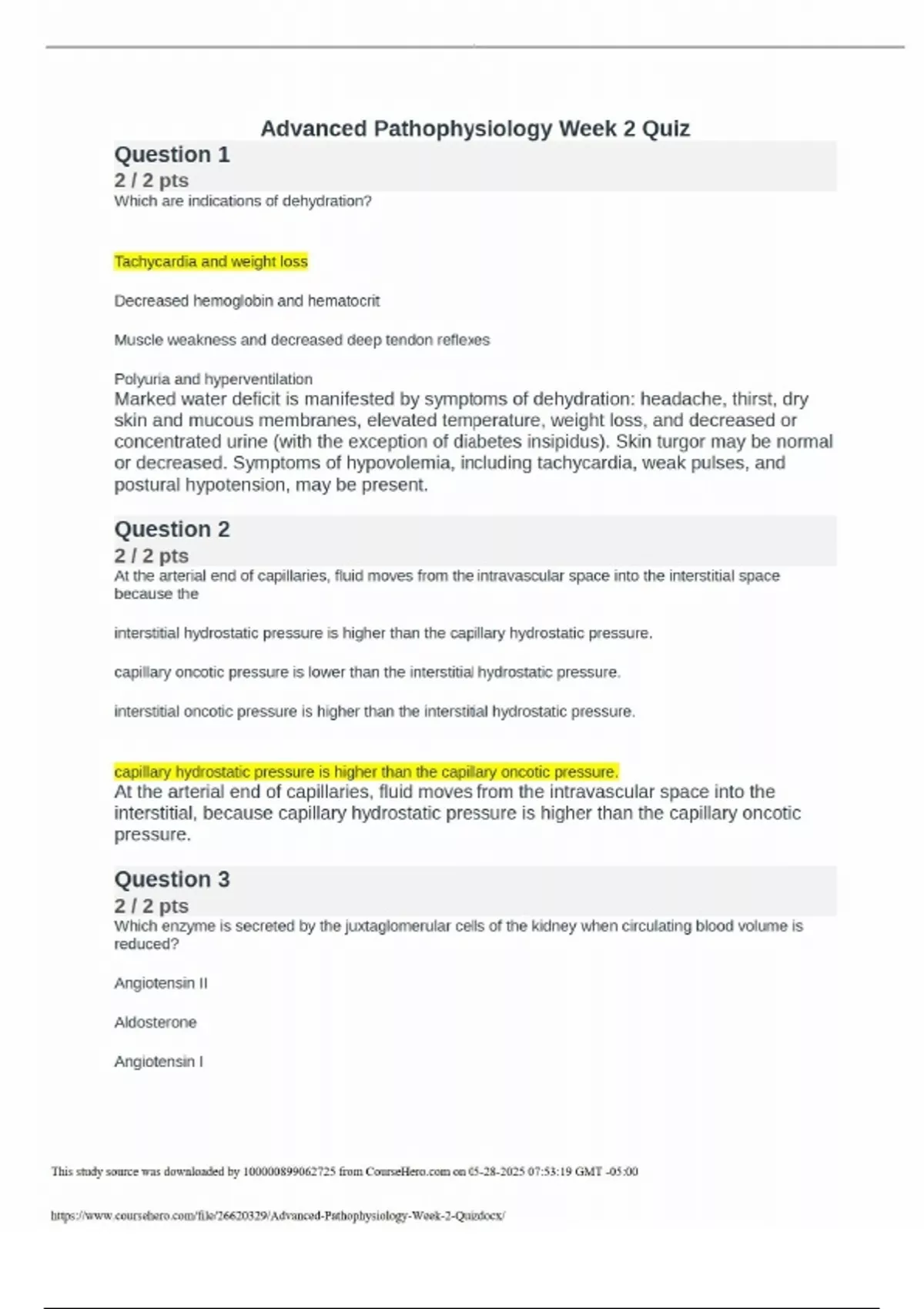 Advanced Pathophysiology Week 2 Quiz Question 1 2 / 2 pts Which are indications of dehydration? Correct! Tachycardia and weight loss Decreased hemoglobin and hematocrit Muscle weakness and decreased deep tendon reflexes Polyuria and hyperventilation Marked water deficit is manifested by symptoms of dehydration: headache, thirst, dry skin and mucous membranes, elevated temperature, weight loss, and decreased or concentrated urine (with the exception of diabetes insipidus). Skin turgor may be normal or decreased. Symptoms of hypovolemia, including tachycardia, weak pulses, and postural hypotension, may be present. Question 2 2 / 2 pts At the arterial end of capillaries, fluid moves from the intravascular space into the interstitial space because the interstitial hydrostatic pressure is higher than the capillary hydrostatic pressure. capillary oncotic pressure is lower than the interstitial hydrostatic pressure. interstitial oncotic pressure is higher than the interstitial hydrostatic pressure. Correct! capillary hydrostatic pressure is higher than the capillary oncotic pressure. At the arterial end of capillaries, fluid moves from the intravascular space into the interstitial, because capillary hydrostatic pressure is higher than the capillary oncotic pressure. Question 3 2 / 2 pts Which enzyme is secreted by the juxtaglomerular cells of the kidney when circulating blood volume is reduced? Angiotensin II Aldosterone Angiotensin I Correct! This study source was downloaded by from CourseH on :53:19 GMT -05:00 When circulating blood volume or blood pressure is reduced, renin, an enzyme secreted by the juxtaglomerular cells of the kidney, is released in response to sympathetic nerve stimulation and decreased perfusion of the renal vasculature. Question 4 2 / 2 pts In hyperkalemia, cardiac rhythm changes are a direct result of Correct Answer cardiac cell hypopolarization. cardiac cell repolarization. You Answered cardiac cell hyperexcitability. depression of the sinoatrial (SA) node. If extracellular potassium concentration increases without a significant change in intracellular potassium, the resting membrane potential becomes more positive (i.e., changes from –90 to –80 mV) and the cell membrane is hypopolarized (the inside of the cell becomes less negative or partially depolarized [increase excitability]). (Electrical properties of cells are discussed in Chapter 1.) Question 5 2 / 2 pts Why are infants susceptible to significant losses in total body water (TBW)? Because they are unable communicate adequately when they are thirsty Because more than half of an infant’s body weight is water Correct! Because an infant’s kidneys are not mature enough to counter fluids losses Because infants have a slow metabolic rate Infants are particularly susceptible to significant changes in TBW because of their high metabolic rate and the accelerated turnover of body fluids caused by their greater body surface area in proportion to total body size. Loss of fluids from diarrhea can represent a significant proportion of body weight. Renal mechanisms that regulate fluid and electrolyte conservation may not be mature enough to counter the losses, so dehydration may develop rapidly. Question 6 2 / 2 pts Physiologic pH is maintained around 7.4 because bicarbonate (HCO3) and carbonic acid (H2CO3) exist in a ratio of This study source was downloaded by from CourseH on :53:19 GMT -05:00 Correct! 20:1. 10:5. 10:2. The relationship between bicarbonate and carbonic acid is usually expressed as a ratio. When the pH is 7.40, this ratio is 20:1 (bicarbonate/carbonic acid). Question 7 2 / 2 pts How does the loss of chloride during vomiting cause metabolic alkalosis? Loss of chloride causes hydrogen to move into the cell and exchange with potassium to maintain cation balance. Correct! Loss of chloride causes retention of bicarbonate to maintain the anion balance. Loss of chloride causes hypoventilation to compensate for the metabolic alkalosis. Loss of chloride stimulates the release of aldosterone, which causes the retained sodium to bind with the chloride. When acid loss is caused by vomiting with depletion of ECF and chloride (hypochloremic metabolic alkalosis), renal compensation is not very effective because the volume depletion and loss of electrolytes (Na+, K+, H+, Cl-) stimulate a paradoxical response by the kidneys. The kidneys increase sodium and bicarbonate reabsorption with excretion of hydrogen. Bicarbonate is reabsorbed to maintain an anionic balance because the ECF chloride concentration is decreased. Question 8 2 / 2 pts Which of the following is a true statement? Hyperventilation results in an increased PaCO2. Correct! Hyperventilation causes hypocapnia. Hyperventilation causes hypercapnia. Hypoventilation causes hypocapnia. Hyperventilation is alveolar ventilation that exceeds metabolic demands. The lungs remove CO2 at a faster rate than it is produced by cellular metabolism, resulting in decreased PaCO2or hypocapnia. This study source was downloaded by from CourseH on :53:19 GMT -05:00 2 / 2 pts _____ is a fulminant form of respiratory failure characterized by acute lung inflammation and diffuse alveolocapillary injury. Acute pulmonary edema Pneumonia Correct! Acute respiratory distress syndrome (ARDS) Pulmonary emboli ARDS is a fulminant form of respiratory failure characterized by acute lung inflammation and diffuse alveolocapillary injury. Question 10 2 / 2 pts Clinical manifestations that include unexplained weight loss, dyspnea on exertion, use of accessory muscles, and tachypnea with prolonged expiration are indicative of Correct! emphysema. asthma. pneumonia. chronic bronchitis. Individuals with emphysema usually have dyspnea on exertion that later progresses to marked dyspnea, even at rest (Table 33-3). Little coughing and very little sputum are produced. The individual often is thin, has tachypnea with prolonged expiration, and must use accessory muscles for ventilation. The anteroposterio
