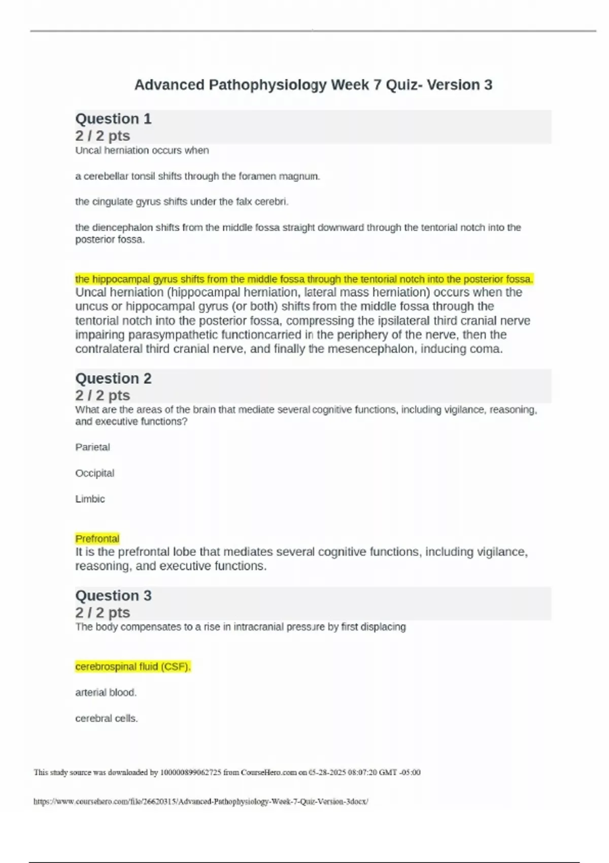 Advanced Pathophysiology Week 7 Quiz- Version 3 Question 1 2 / 2 pts Uncal herniation occurs when a cerebellar tonsil shifts through the foramen magnum. the cingulate gyrus shifts under the falx cerebri. the diencephalon shifts from the middle fossa straight downward through the tentorial notch into the posterior fossa. Correct! the hippocampal gyrus shifts from the middle fossa through the tentorial notch into the posterior fossa. Uncal herniation (hippocampal herniation, lateral mass herniation) occurs when the uncus or hippocampal gyrus (or both) shifts from the middle fossa through the tentorial notch into the posterior fossa, compressing the ipsilateral third cranial nerve impairing parasympathetic functioncarried in the periphery of the nerve, then the contralateral third cranial nerve, and finally the mesencephalon, inducing coma. Question 2 2 / 2 pts What are the areas of the brain that mediate several cognitive functions, including vigilance, reasoning, and executive functions? Parietal Occipital Limbic Correct! Prefrontal It is the prefrontal lobe that mediates several cognitive functions, including vigilance, reasoning, and executive functions. Question 3 2 / 2 pts The body compensates to a rise in intracranial pressure by first displacing Correct! cerebrospinal fluid (CSF). arterial blood. cerebral cells. This study source was downloaded by from CourseH on :07:20 GMT -05:00 A rise in intracranial pressure necessitates an equal reduction in volume of the other contents. The most readily displaced content of the cranial vault is CSF. Question 4 2 / 2 pts Subarachnoid hemorrhage causes communicating hydrocephalus by obstructing the cerebrospinal fluid flow into the subarachnoid space. Correct! the absorption of cerebrospinal fluid by the arachnoid villi. the cerebrospinal fluid flow between the ventricles. blood flow to the arachnoid villi. Hydrocephalus from impaired absorption outside the ventricles is called communicating (extraventricular) hydrocephalus. Question 5 0 / 2 pts With receptive dysphasia (fluent), the individual is able to respond in writing, but not in speech. You Answered respond verbally, but not comprehend speech. Correct Answer comprehend speech, but not respond verbally. speak back, but not comprehend speech. Receptive dysphasia may result in expressive deficits. Question 6 2 / 2 pts Dementia is characterized by easy distractibility and poor concentration. irritability, agitation, and restlessness. Correct! loss of recent and remote memory. deficits in attention and coherence of thought. This study source was downloaded by from CourseH on :07:20 GMT -05:00 characterized by reduction in cognitive functions (intellectual function). Mental abilities are impaired, with a decrease in orienting, recent memory, remote memory, language, executive attentional functions, and alterations in behavior. Question 7 0 / 2 pts In Parkinson disease (PD), the basal ganglia influences the hypothalamic function to produce which grouping of clinical manifestations? You Answered Bradykinesia of chewing, swallowing, and articulation Involuntary contractions of skeletal muscles that impair active and passive movement Asymmetric, regular, rhythmic tremors with slow alternating flexion and extension contractions Correct Answer Inappropriate diaphoresis, orthostatic hypotension, constipation, and urinary retention The basal ganglia influence hypothalamic function (autonomic and neuroendocrine) through pathways connecting the hypothalamus with the basal ganglia and cerebral cortex. Common autonomic symptoms in PD include inappropriate diaphoresis, gastric retention, constipation, and urinary retention. Question 8 0 / 2 pts The existence of regular, deep, and rapid respirations after a severe closed head injury is indicative of neurologic injury to the Correct Answer lower midbrain. supratentorial. pontine area. You Answered cerebral area. Central reflex hyperpnea, a sustained deep rapid but regular pattern (hyperpnea), may result from central nervous system damage or disease that involves the lower midbrain and upper pons. It is seen after increased intracranial pressure and blunt head trauma. Question 9 2 / 2 pts Which disorder has clinical manifestations that include decreased consciousness for up to 6 hours as well as retrograde and posttraumatic amnesia? Correct! This study source was downloaded by from CourseH on :07:20 GMT -05:00 Cortical contusion Mild concussion Acute subdural hematoma Evidence of this disorder is the immediate loss of consciousness, which lasts less than 6 hours. Retrograde and anterograde (posttraumatic) amnesia is also present. Question 10 2 / 2 pts Which clinical manifestation is characteristic of cluster headaches? Throbbing headache with intermittent burning sensation Gradual onset of bilateral pain with sensation of a tight band around the head Correct! Severe unilateral tearing, burning, or temporal pain Aura before the headache with photophobia and nausea and vomiting The headache attack usually begins without warning and is characterized by severe, unilateral tearing, burning, periorbital, and retrobulbar or temporal pain lasting 30 minutes to 2 hours. Question 11 2 / 2 pts Amyotrophic lateral sclerosis (ALS) is characterized by demyelination of central nervous system neurons. an autosomal dominant genetic disorder. an autoimmune disorder caused by a virus. Correct! upper and lower motor neuron degeneration. ALS (sporadic motor system disease, sporadic motor neuron disease, motor neuron disease) is a worldwide degenerative disorder diffusely involving lower and upper motor neurons. Question 12 0 / 2 pts The most severe diffuse brain injury caused by rotational acceleration is most likely to be located in the diencephalon. You Answered This study source was downloaded by from CourseH on :07:20 GMT -05:00 entire brainstem. Correct Answer diencephalon to the brainstem. Severe diffuse axonal injury (DAI), formerly called primary brainstem injury or brains