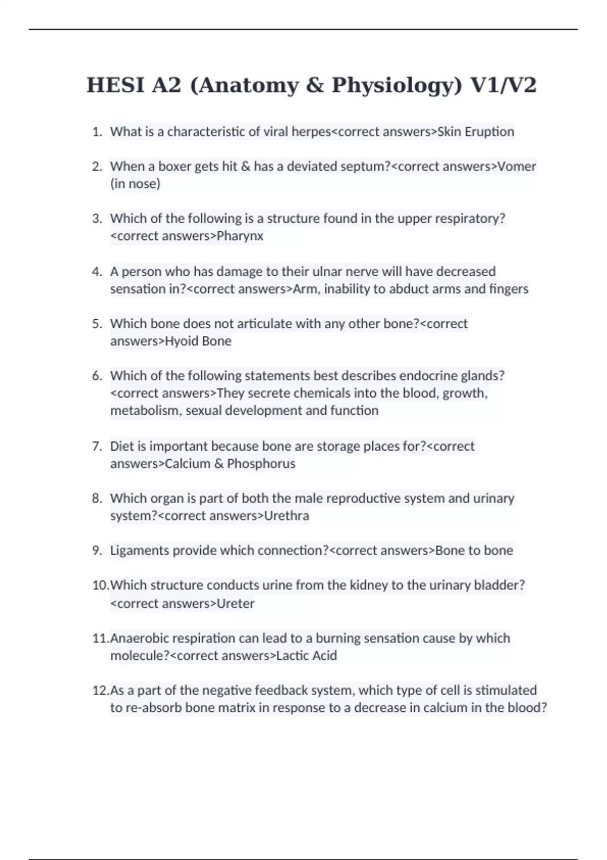 HESI A2 (Anatomy & Physiology) V1/V2
