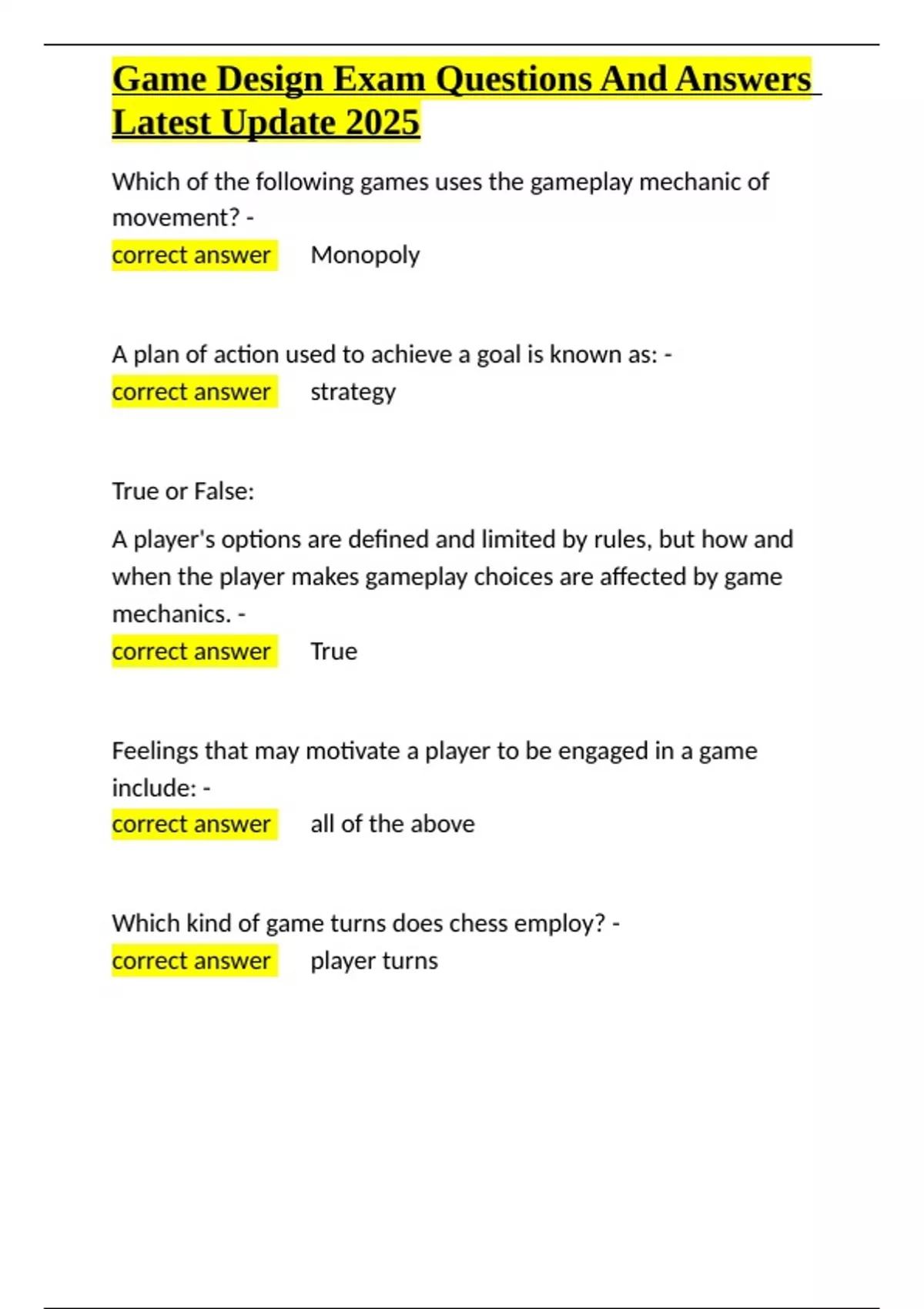 , Game Design Exam Questions And Answers