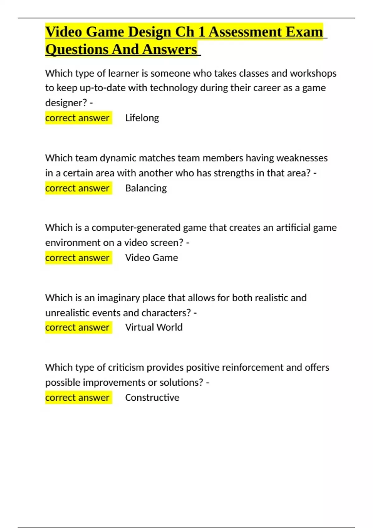 , Video Game Design Ch 1 Assessment Exam