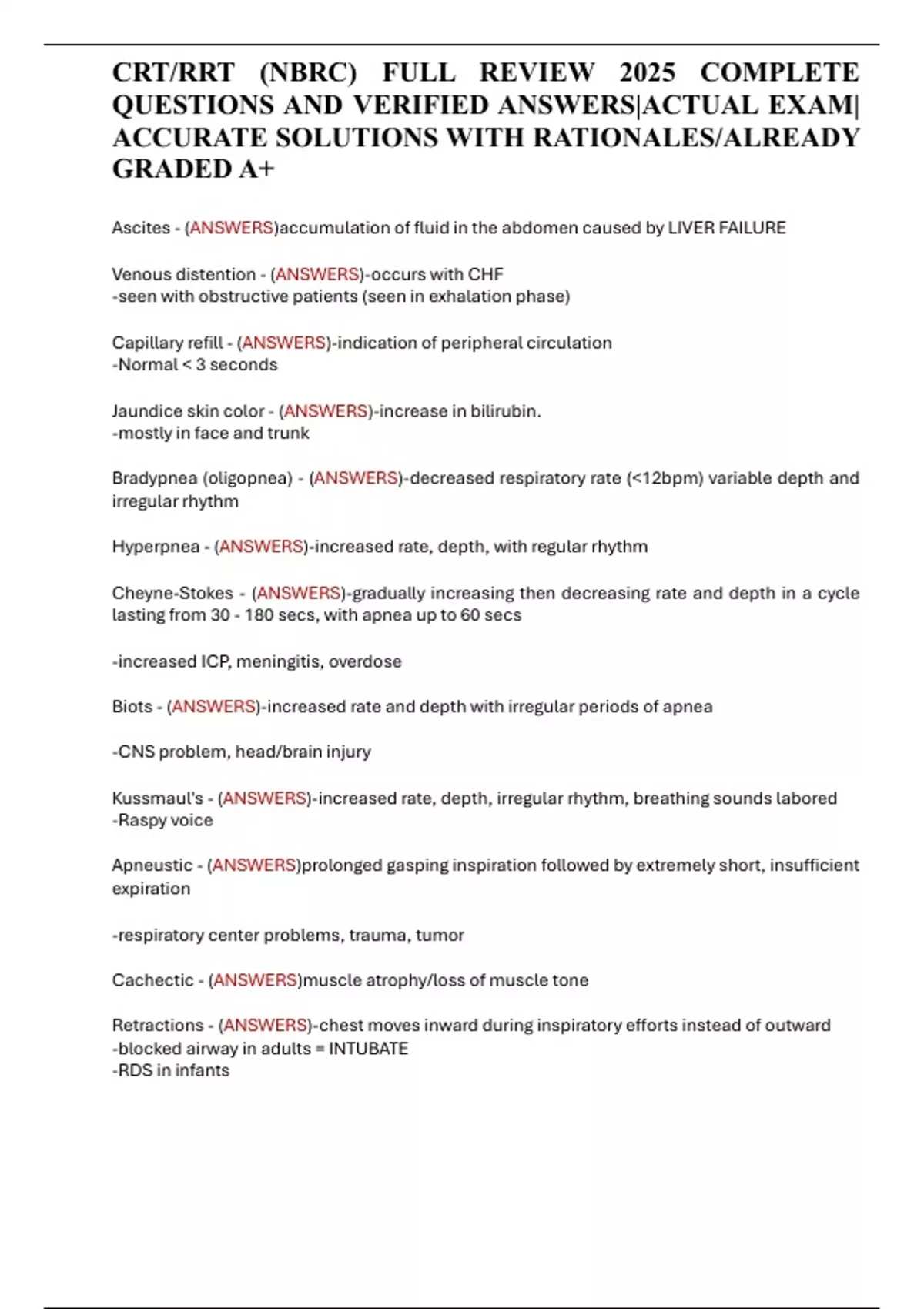 CRT/RRT (NBRC) FULL REVIEW 2025 COMPLETE QUESTIONS AND VERIFIED ANSWERS|ACTUAL EXAM| ACCURATE SOLUTIONS WITH RATIONALES/ALREADY GRADED A+