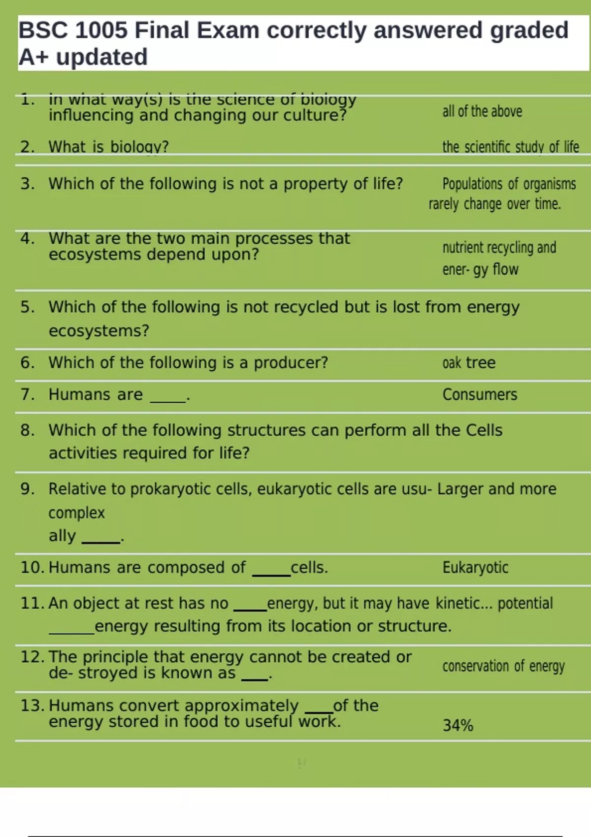 , BSC 1005 Final Exam correctly answered graded